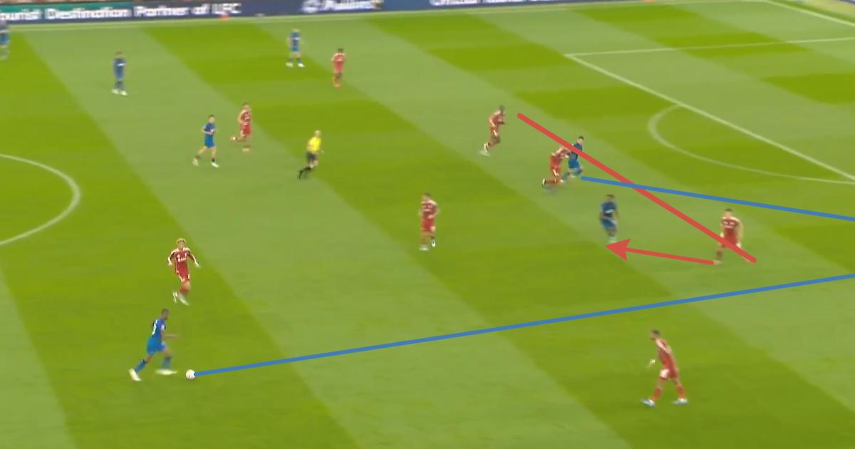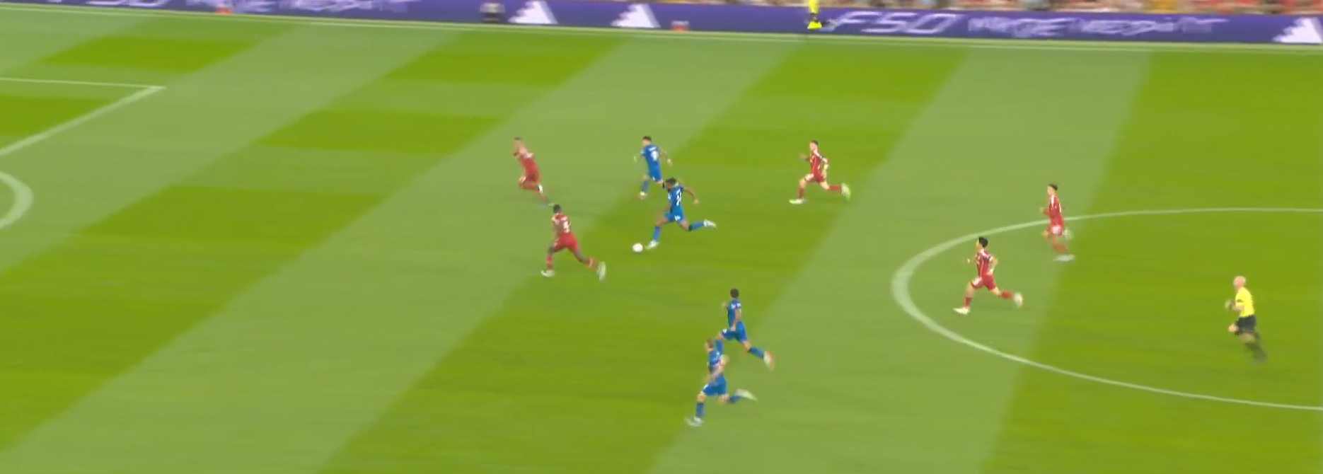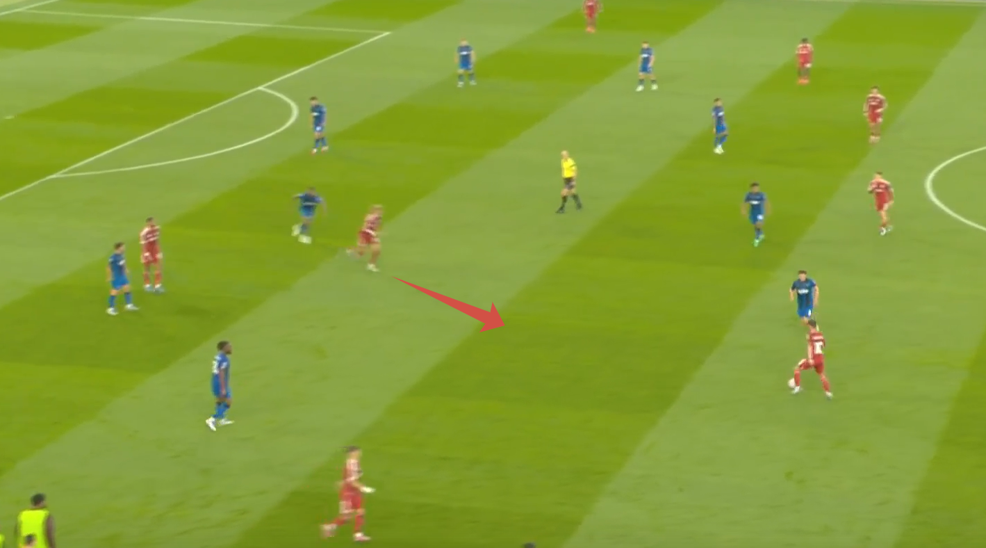 Здесь Уго показывает, почему заплаченные за него 90 млн абсолютно оправданы. Экитике «раздергал» Диаките, который выбросился и остался в полупозиции: освободил зону и не доиграл эпизод. Уго хотел вновь наполнить зону, но увидел подключение Виртца и решил увести Диаките дальше из зоны, отыгравшись с партнером, создал открытый мяч Маккалистеру, обнаруживает зону, которую ему создали Виртц своим движением и Сенеси своей безответственностью (аргентинец четко видит, что он является страхующим защитником и что Адамс доигрывает эпизод за Виртцем, при этом идет вторым игроком в Виртца, оставляя самую важную зону – центральную). Диаките продолжает «держать воздух», Трюффе не сужает линию обороны, хотя должен по цепочке страховать зону партнера (Сенеси).