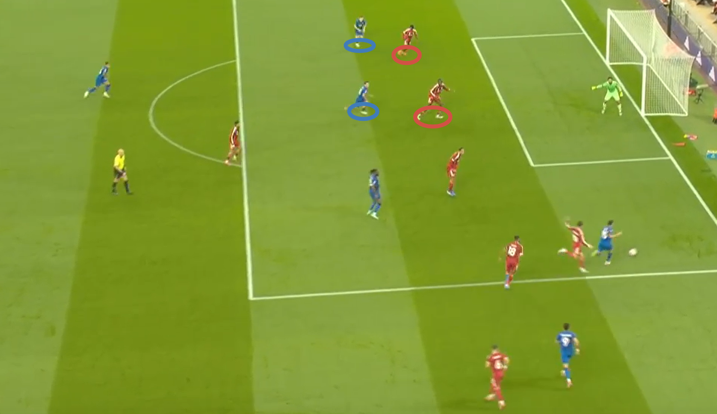 - У «Ливерпуля» отлично получается создавать и пользоваться пространством в полуфлангах и 14-ой зоне за счет грамотного взаимодействия Виртца и Экитике. Как снизилась активность во втором тайме от французского форварда, так игра в атаке команды стала кратно менее вариативной.