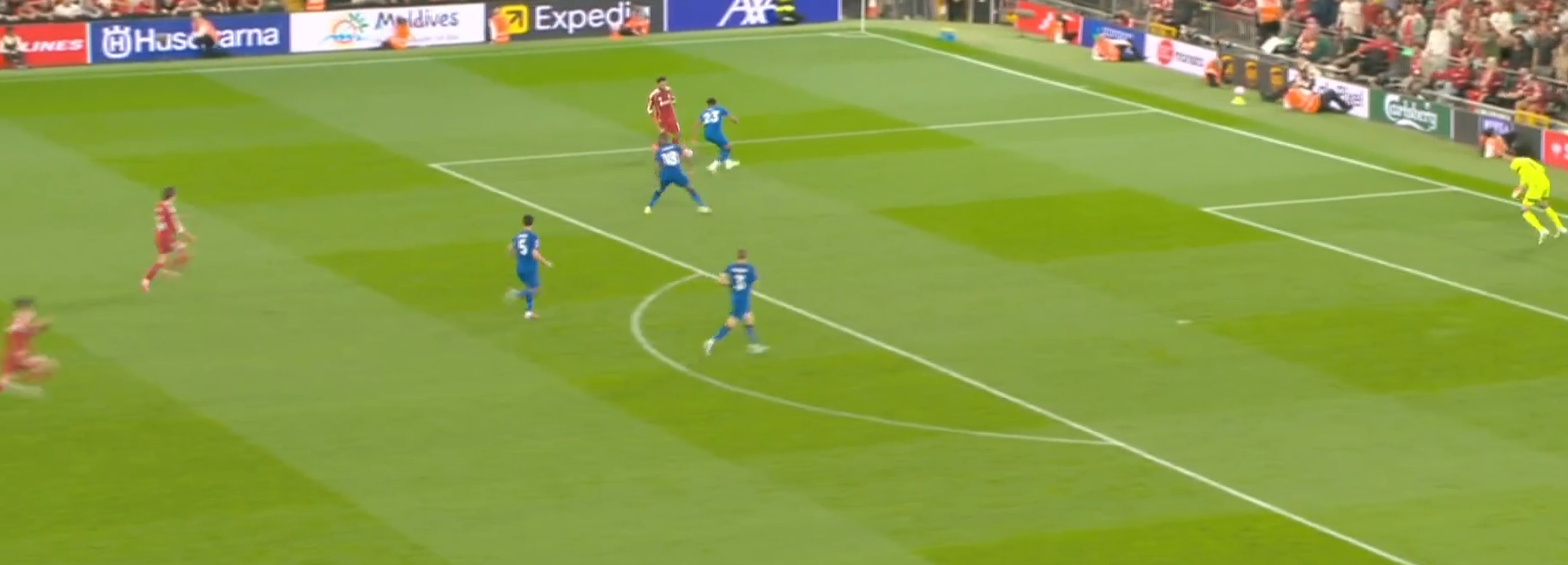 В эпизоде с четвертым голом «Ливерпуля» Хилл плассируется против Салаха, который уже в штрафной, понимая, что у Мохаммеда рабочая левая нога и что его (Хилла) страхуют в центре, готовится к тому, что Салах будет его обыгрывать в бровку, чтобы уйти под «рабочую» ногу. В этот же момент Диаките открывает Салаху пространство для смещения в центр, хоть и под правую ногу (самоустраняюсь), вновь оказавшись в полупозиции, перекрывает обзор вратарю и открывает «домик».