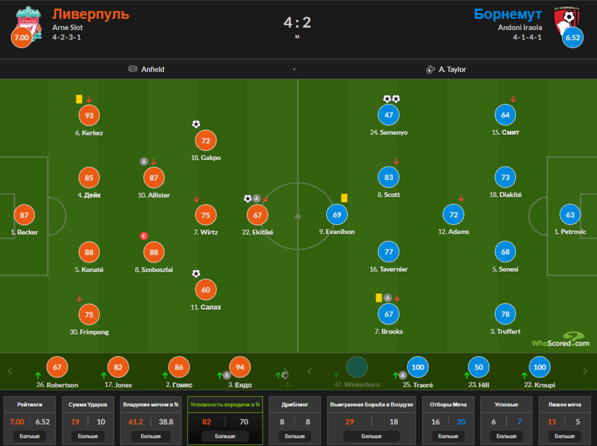Если вариативность «Ливерпуля» сложно описать, то «Борнмут» придерживался старой английской классики: в основном фланговые атаки и использование размена Семеньо на Керкеша.
