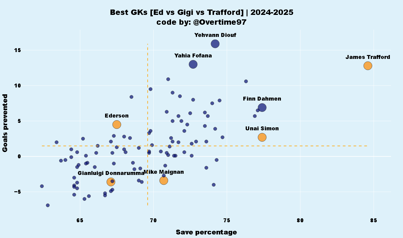 Что мы имеем. Итальянец далеко не так крут в шотстоппинге на дистанции, по крайней мере в прошлом сезоне. Он также очень ограничен в игре ногами, что было особенно заметно в больших матчах. Из других вариантов был неплохой Симон и хороший на мяче Меньян. Джиджи моложе, но уже имеет больше опыта на элитном уровне. При всём этом, Эдерсон, учитывая глубокую статистику, не заслуживает столько критики.