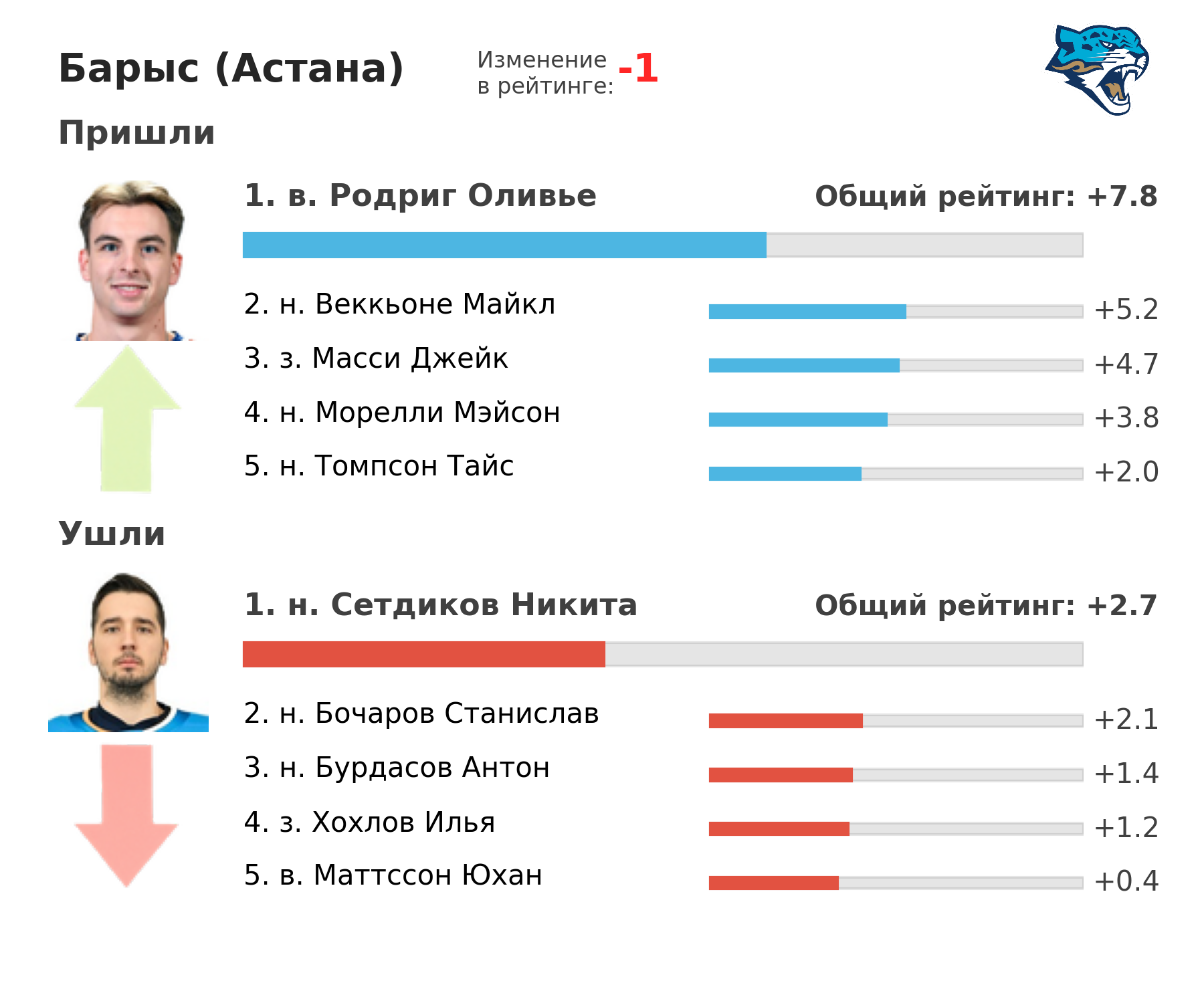 В межсезонье «Барыс» провел масштабное обновление состава, стараясь выйти из состояния свободного падения прошлого года. Команду усилили несколько легионеров высокого уровня: Майкл Веккьоне, Джейк Масси и Мэйсон Морелли. Все трое оцениваются как игроки уровня первого звена КХЛ, а Родриг Оливье как вратарь уровня топ-10.