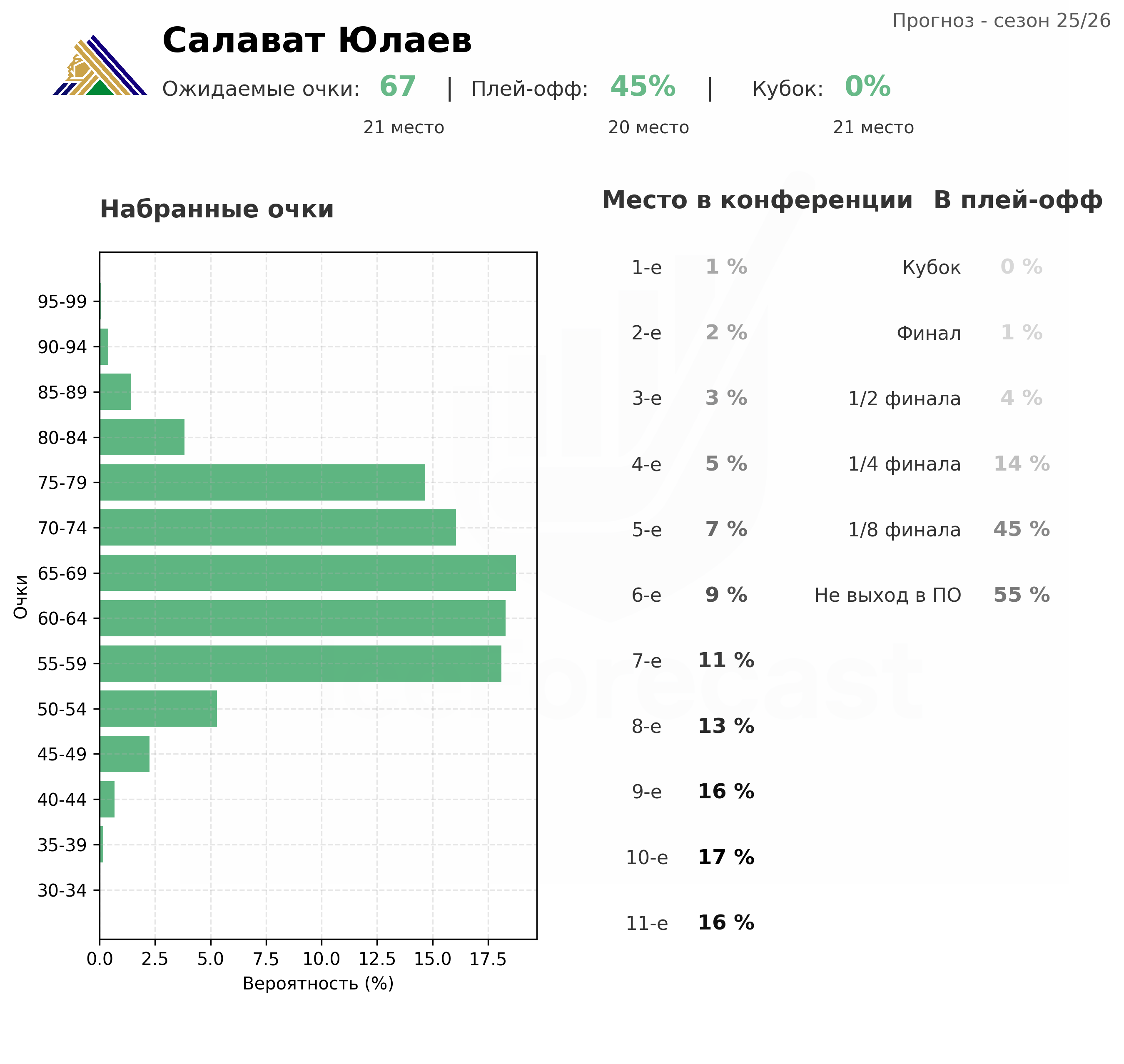 Уфимский клуб вступает в сезон 2025/26 в режиме перестройки после ухода большинства лидеров, и от команды теперь ждут скорее борьбы за плей-офф, чем новых кубковых прорывов. Сильное ядро в лице Хмелевского, Василевского и Самонова позволяет отчасти сохранить надежду, но слабая глубина атаки и высокая зависимость развития внутренних резервов делают шансы на серьезный успех минимальными. На данном этапе задача «Салавата» — закрепиться в плей-офф и избежать провала, а о повторении прошлых высоких результатов говорить пока рано.