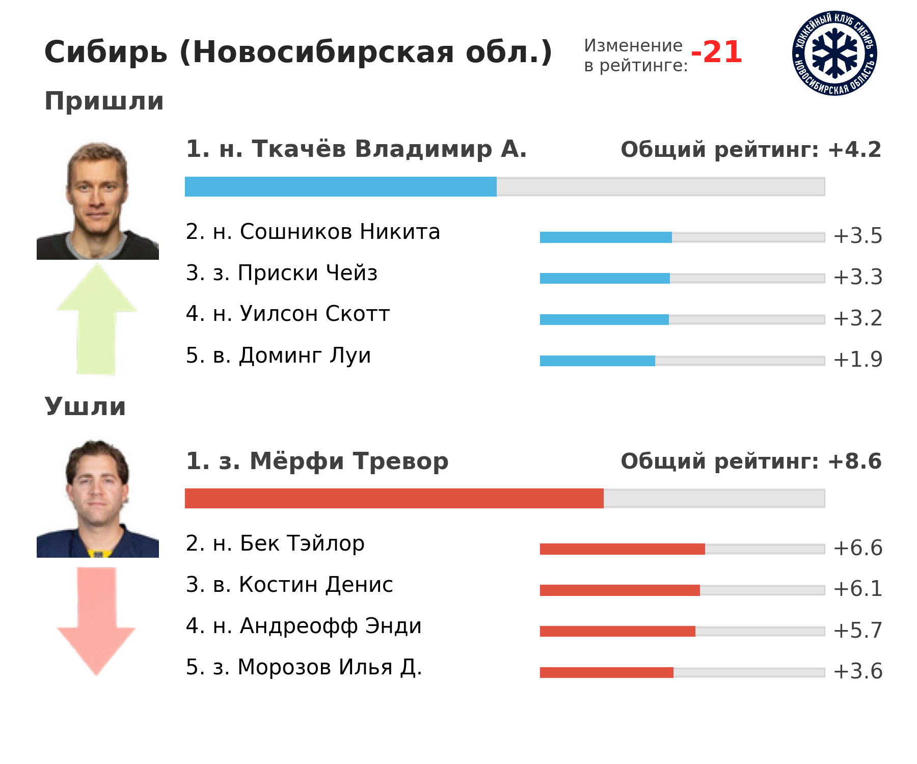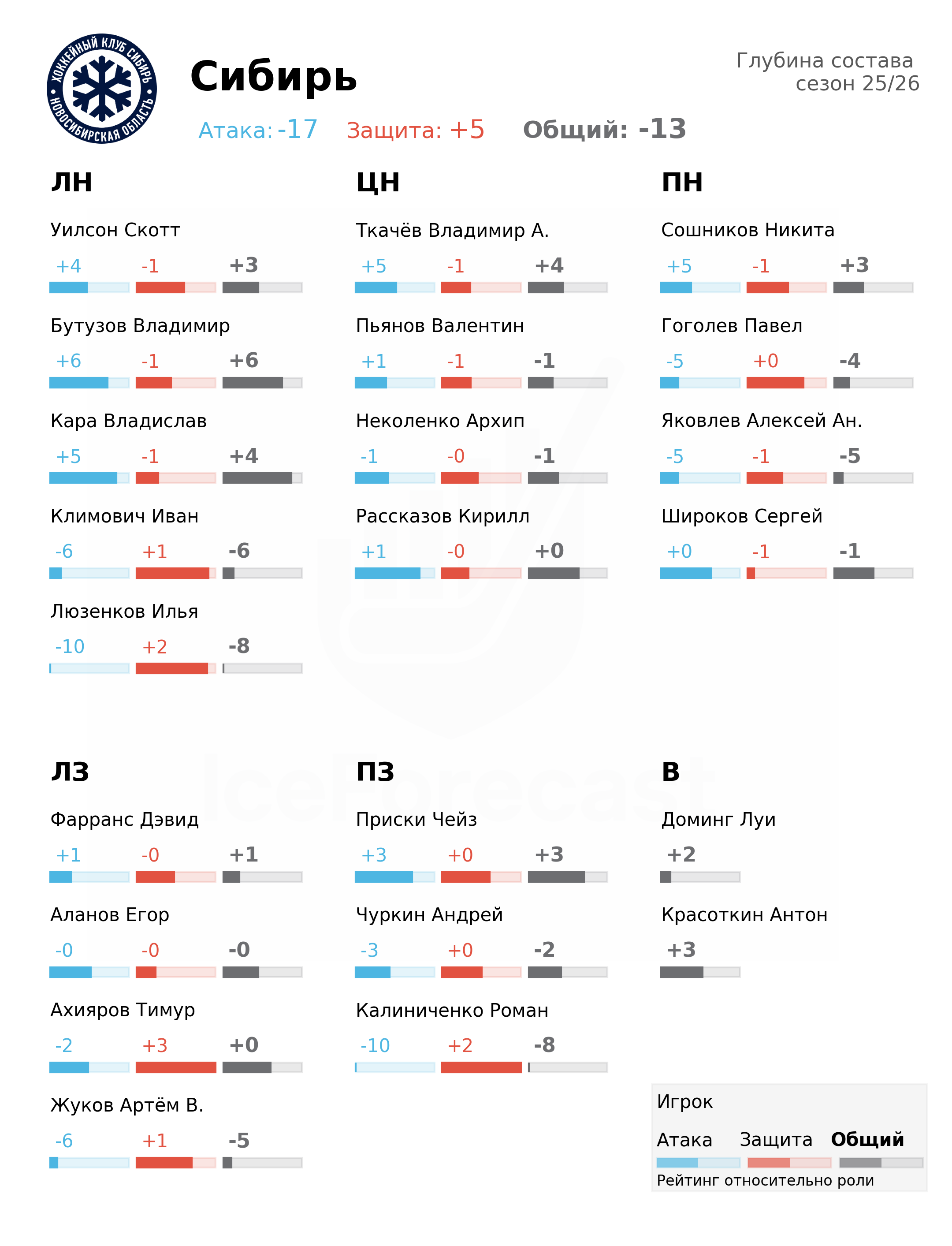 По совокупным атакующим метрикам «Сибирь» остается в числе аутсайдеров лиги. Команде не хватает игроков топ-уровня, и многие вынуждены играть роли выше своих оптимальных. Надежда связана с тем, что Сошников и Уилсон добавят остроты в атаке, Ткачев восстановит форму, а Приски сможет заменить хотя бы часть вклада Мерфи. С небольшой помощью от игроков второго эшелона «Сибирь» может обрести глубину, необходимую для серьезной борьбы в плей-офф.