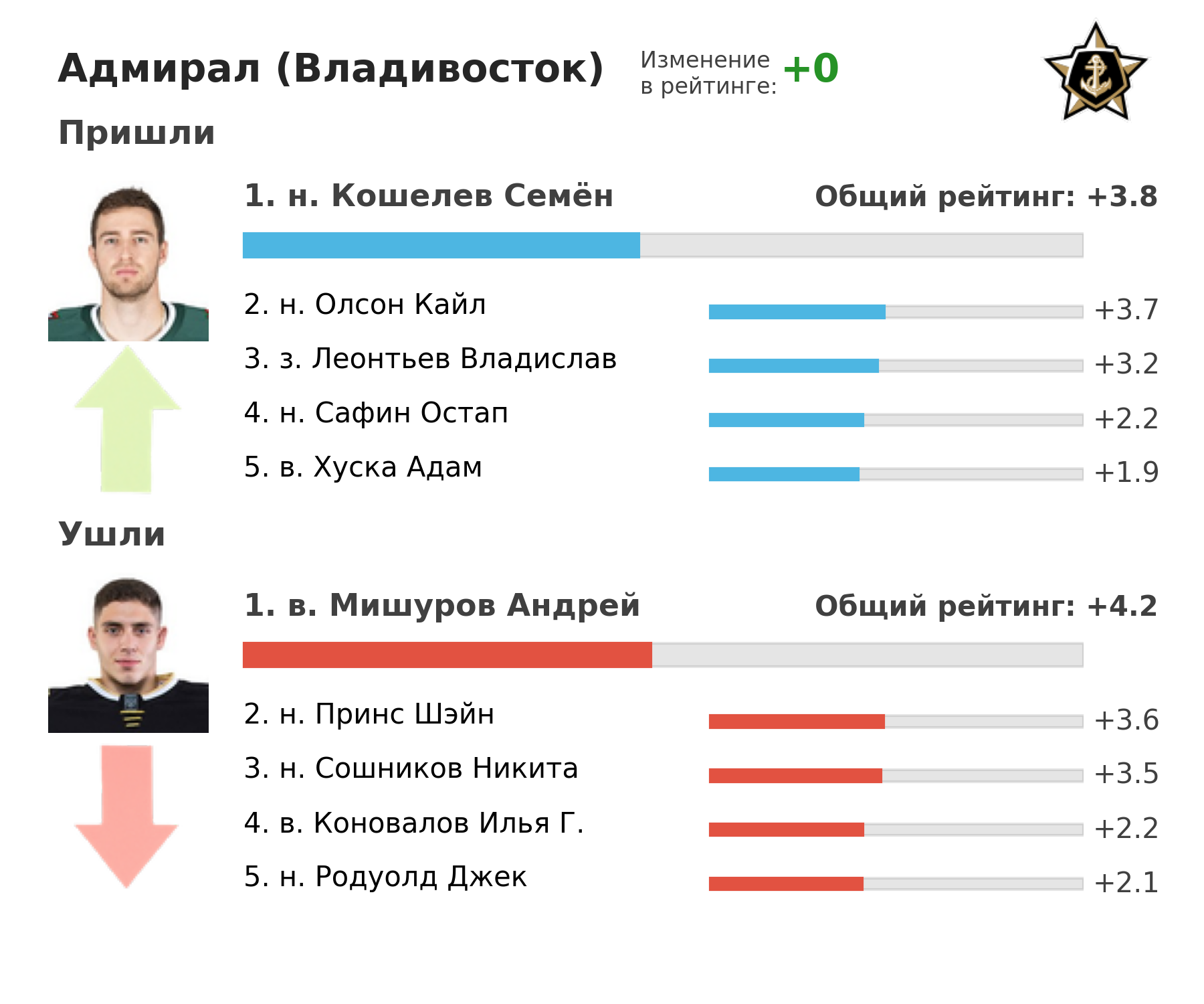 Адмирал провел ровное межсезонье. Потеря Никиты Сошникова, Джека Родуолда и Шейна Принса компенсируется приходом Владислава Леонтьева, Семена Кошелева и Кайла Олсона. Кошелев стабильно остается положительным игроком с показателем GF% выше 53% на протяжении почти всей карьеры за исключением короткого отрезка в «Металлурге». Олсон прогнозируется как надежный легионер для топ-6. Леонтьев в прошлом сезоне был лидером «Нефтехимика» по GF% (52%).