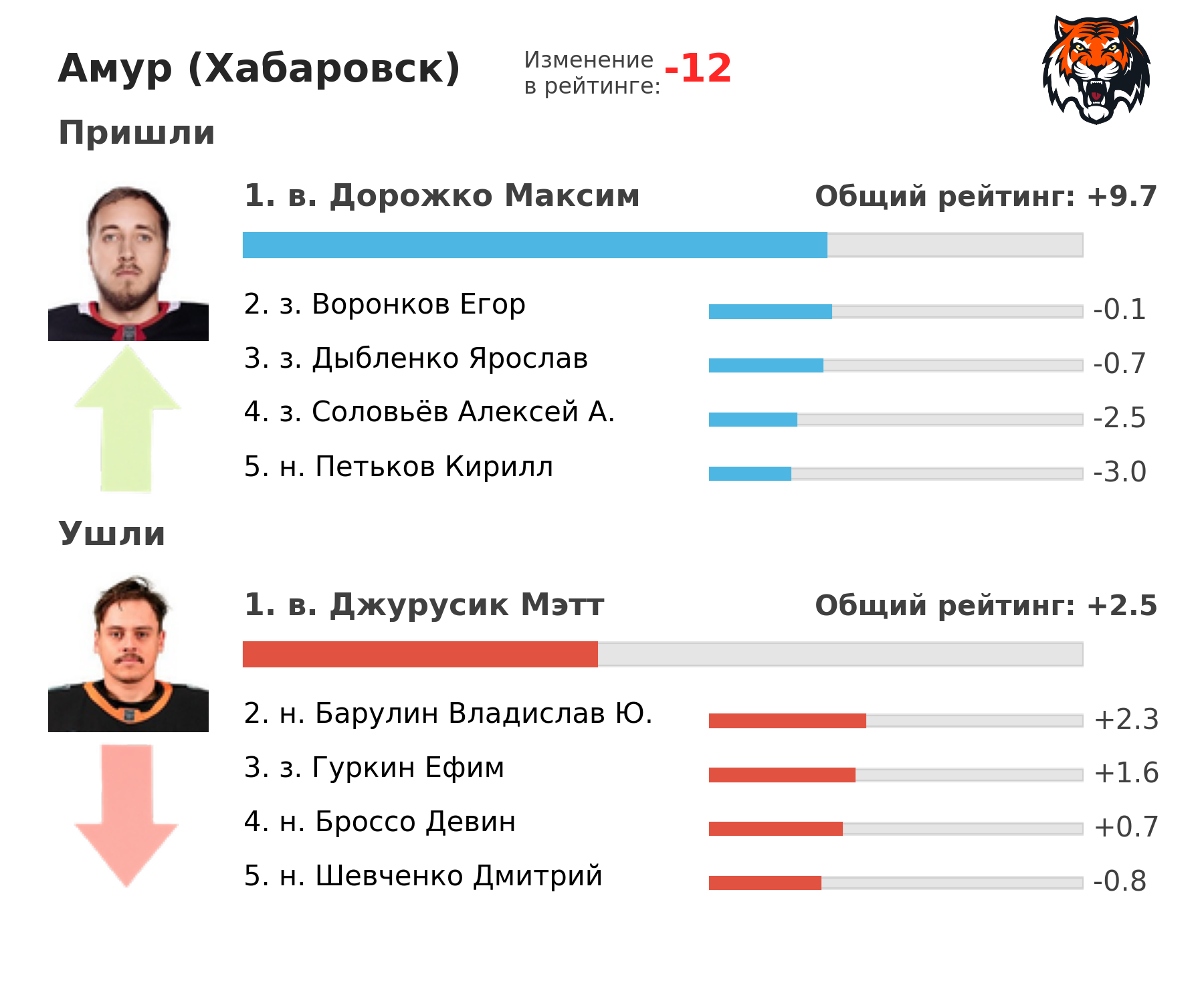 Главным приобретением стал вратарь Максим Дорожко, который в прошлом сезоне за «Витязь» вошел в топ-10 КХЛ как по рейтингу (9-е место), так и по количеству сейвов (6-е) и стал самым ценным вратарем, сменившим команду этим летом. Из потерь выделяются Владислав Барулин и Девин Броссо, вошедшие в шестерку игроков «Амура» с наибольшей долей голов команды, пришедшихся на их смены.