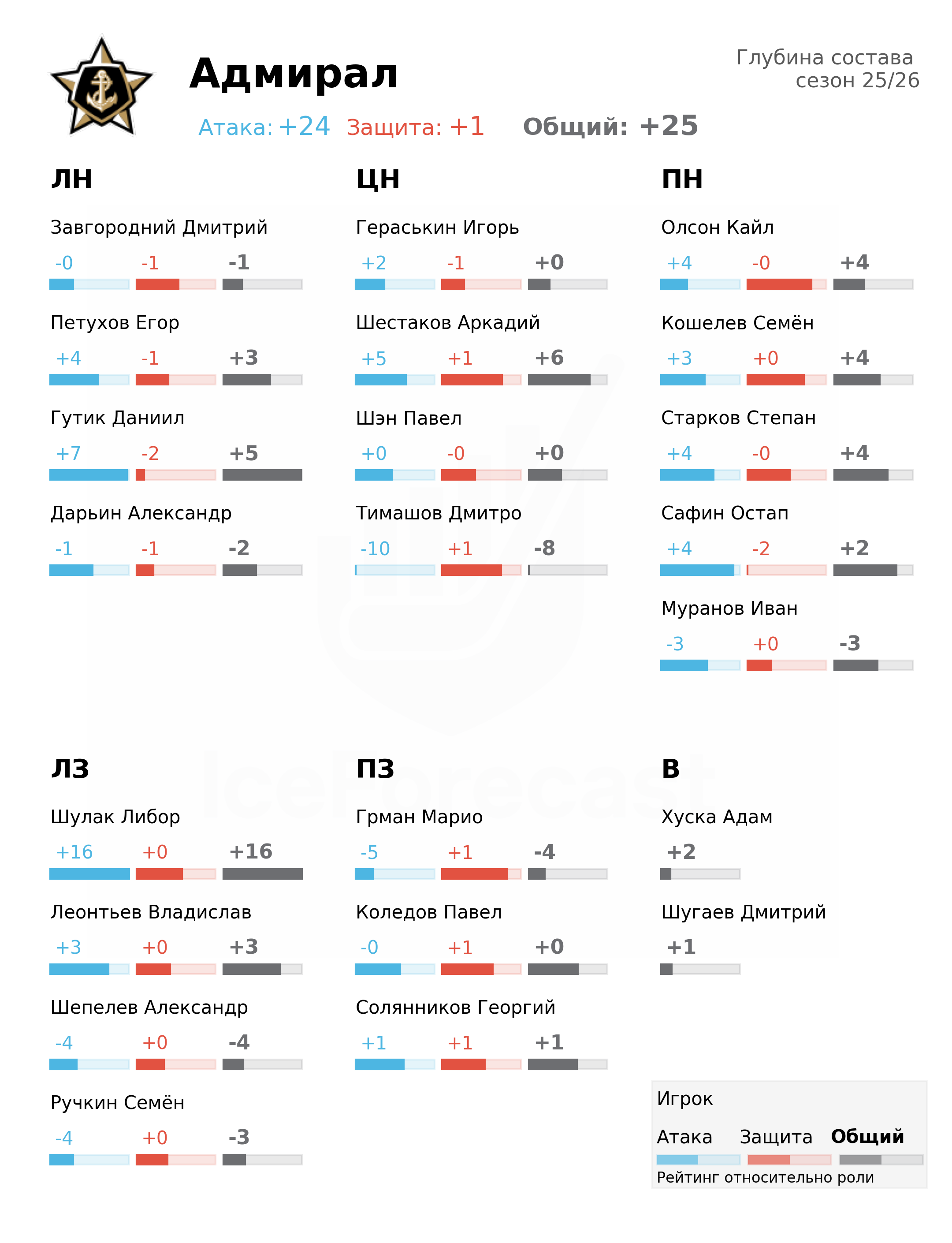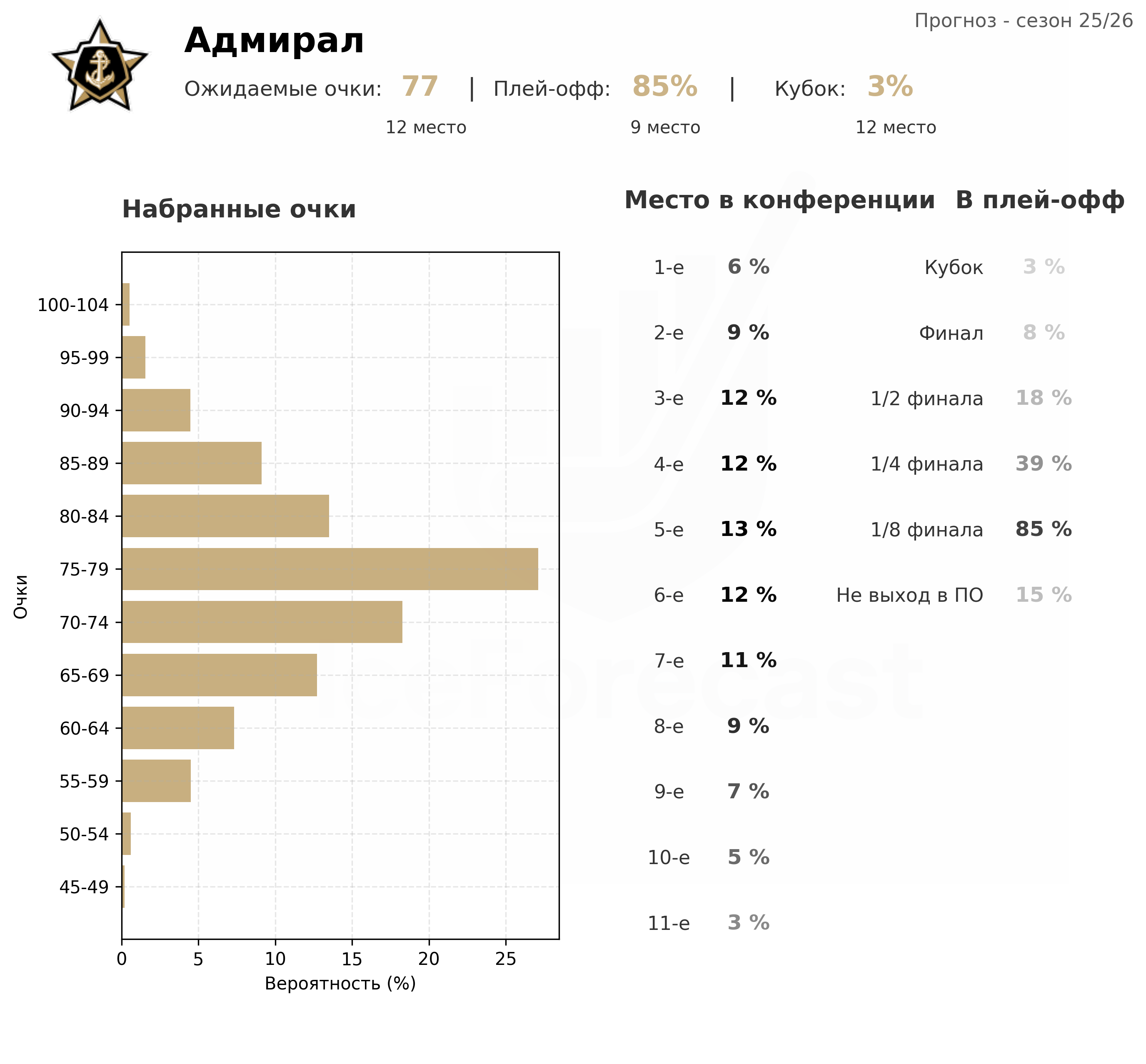 «Адмирал» вступает в сезон 2025/26 с обновленным, но сбалансированным составом и привычной ставкой на дисциплину и командный хоккей. Потеря ряда лидеров компенсирована точечными приобретениями, которые должны укрепить глубину, особенно в атаке. По большинству метрик команда уверенно держится в середине турнирной таблицы КХЛ, а ее оборона остается сильной стороной. «Адмирал» прогнозируется как стабильный участник плей-офф. Их основная цель — удержаться в топ-8 Востока и попытаться пройти дальше первого раунда.
