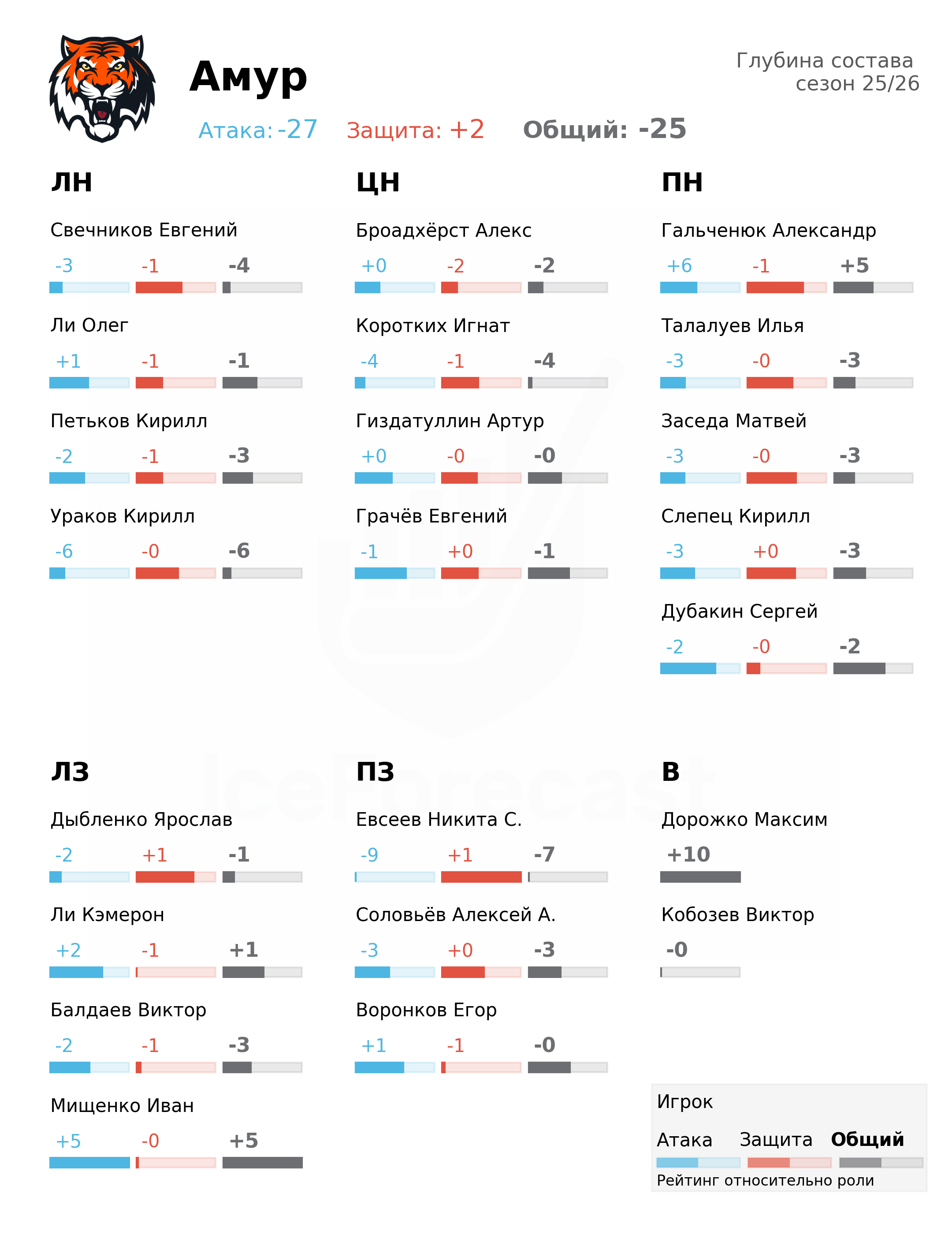 Кроме Александра Гальченюка тяжело выделить сильных игроков в нападении «Амура». По большинству атакующих метрик команда котируется в нижней четверти таблицы. Главное преимущество в том, что «Амур» довольно ровная команда и при любых комбинациях нижние звенья оцениваются даже как «выше среднего», особенно по оборонительным метрикам. В обороне стоит отметить Ивана Мищенко, который в прошлом сезоне стал лучшим в команде по GF% среди сыгравших больше 40 матчей, а в этом сезоне он прогнозируется как лучший защитник команды.