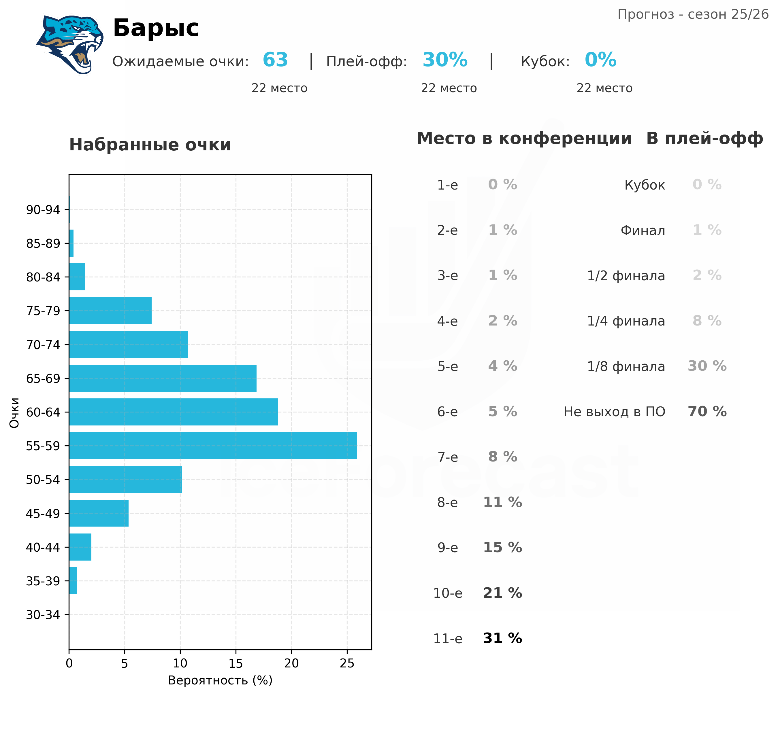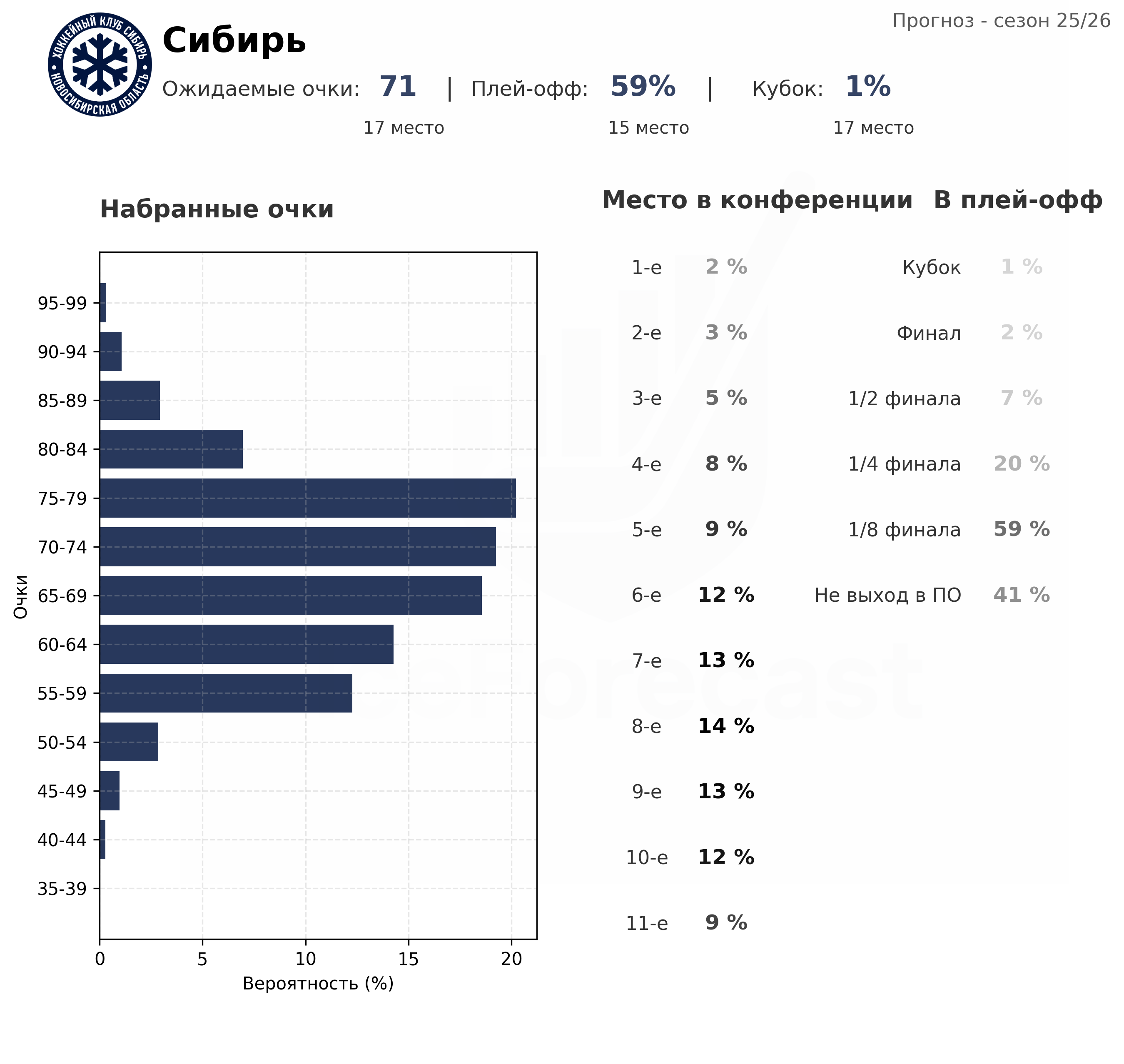 Сейчас «Сибирь» оценивается как команда уровня борьбы за плей-офф с вероятным местом в диапазоне 6–10 места. Однако пробиться во второй раунд будет крайне сложно — лишь в трех сценариях из десяти это удавалось по модельным сценариям.
