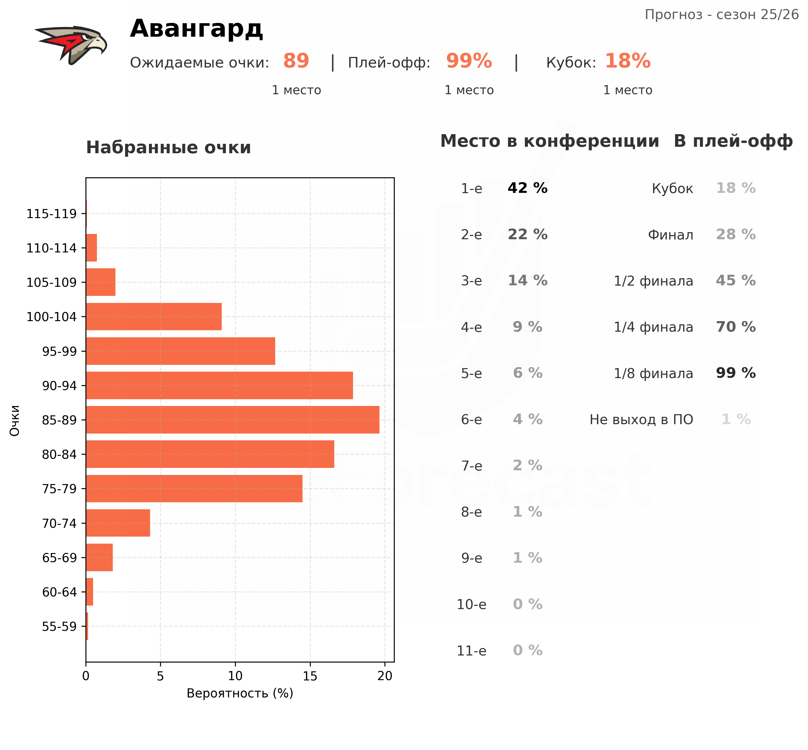 «Авангард» входит в сезон 2025/26 как один из главных претендентов на Кубок Гагарина. Укрепив состав рядом сильных новичков и сохранив прочное ядро, омский клуб выглядит максимально сбалансированным и конкурентоспособным практически во всех линиях. По ключевым метрикам команда уже сейчас в числе лидеров лиги, а прогнозы ставят ее в фавориты Восточной конференции, а также всего чемпионата. Для «ястребов» новый сезон — это не столько этап перестройки, сколько реальная возможность подтвердить статус топ-клуба и замахнуться на главный трофей.