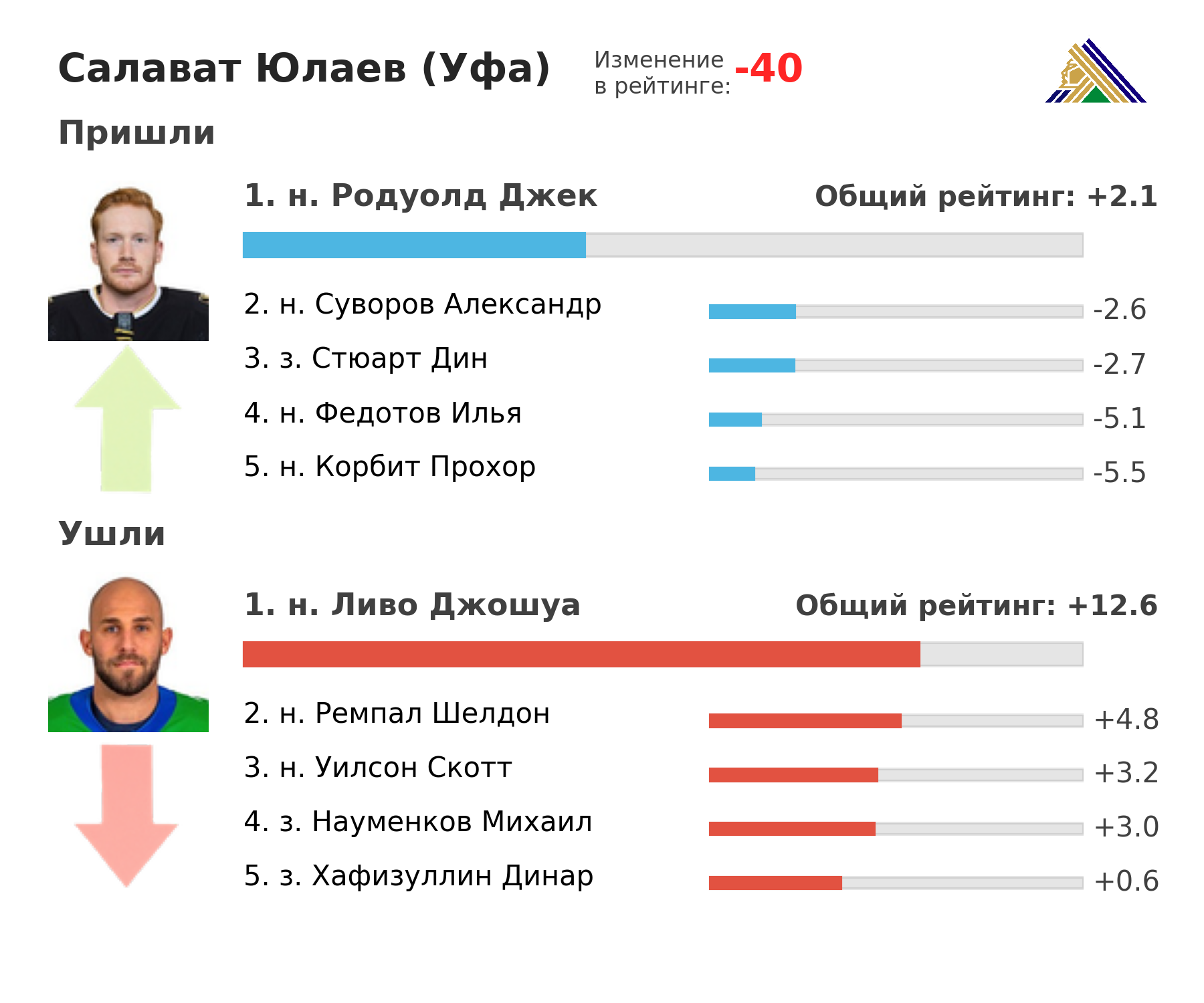 Лето стало тяжелым для «Салавата»: из десяти лучших игроков прошлого сезона ушли шестеро, включая MVP КХЛ-2024/25 Джошуа Ливо. Усиление выглядит скромнее — из новичков только Джек Родуолд, который котируется моделью как игрок с положительным влиянием.