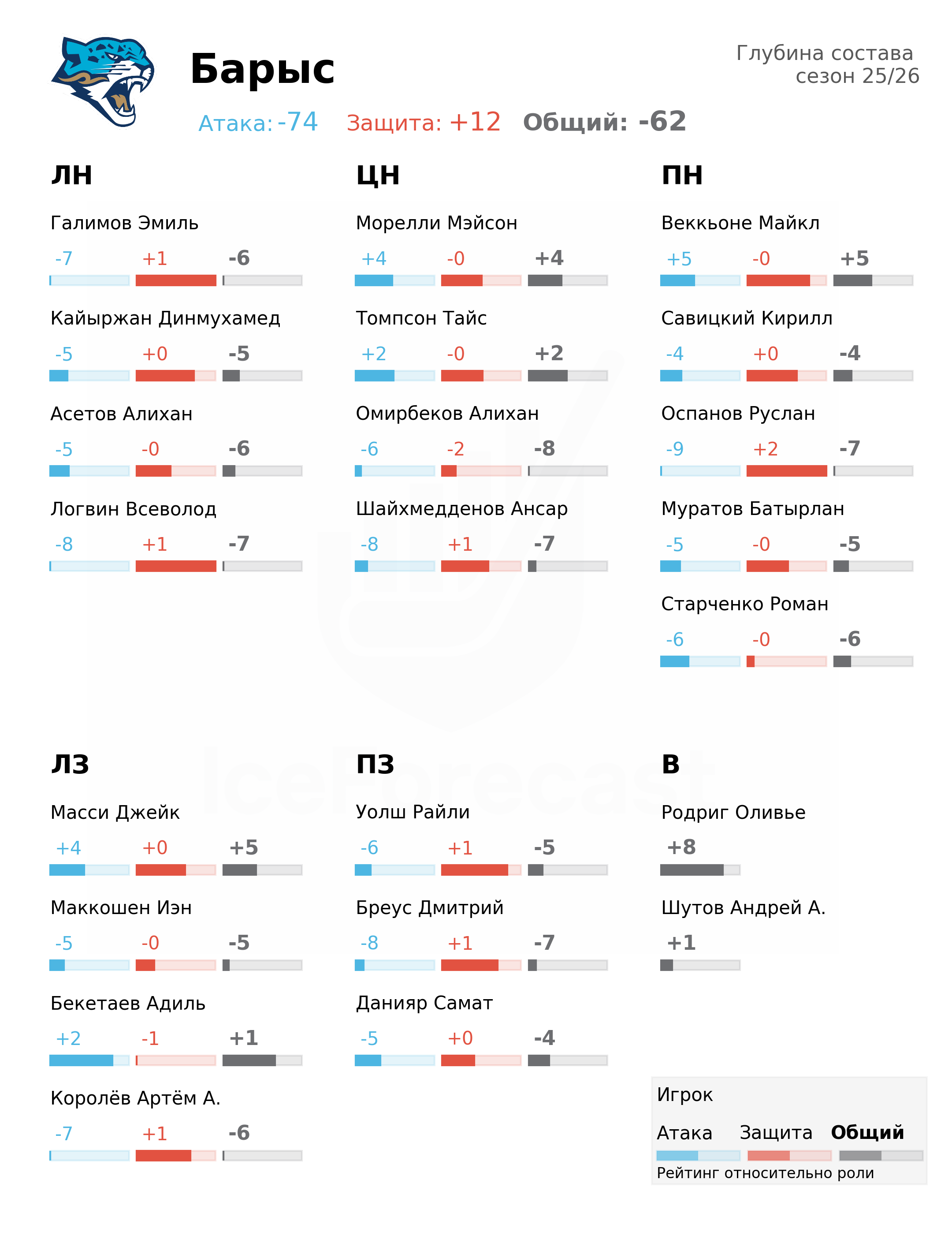 За пределами легионерской группы ситуация остается критической. Лишь один игрок имеет положительный рейтинг, и только у двоих он выше –4. Это во многом объясняется провальным прошлым сезоном, однако восстановление доверия модели потребует времени. По общему рейтингу как атаки, так и обороны «Барыс» замыкает таблицу лиги.