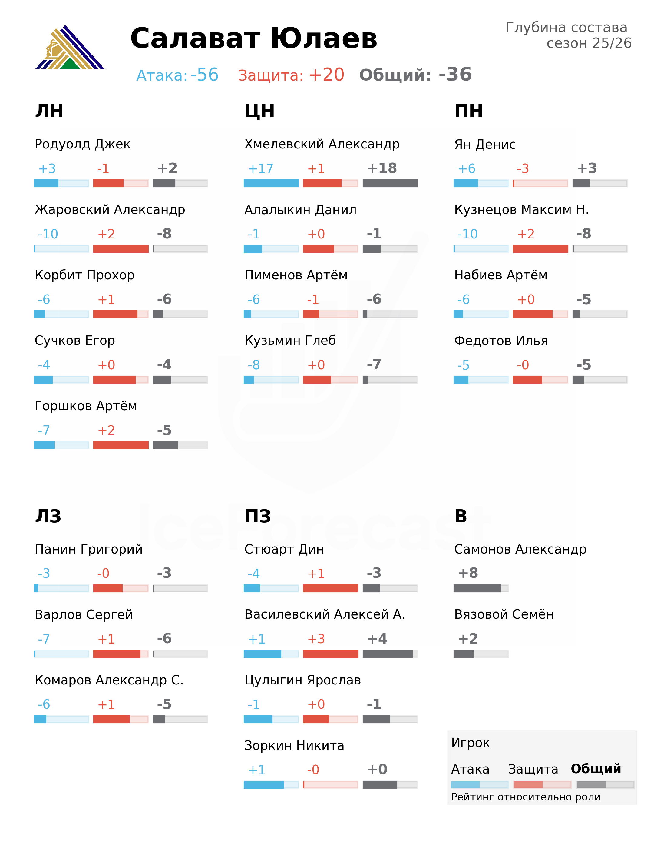За пределами первого звена глубина состава минимальна. Но стоит отметить, что часть молодых игроков, например Александра Жаровского, модель пока не может точно оценить из-за малой выборки. Ключевые фигуры остаются в строю: лучший центр лиги Александр Хмелевский, ведущий оборонительный защитник Алексей Василевский и вратарь Александр Самонов, оцениваемый как один из сильнейших в КХЛ. Благодаря этому уфимцы удерживают высокие позиции по оборонительным метрикам, а при развитии внутренних резервов команда способна вернуться в число лидеров Востока.