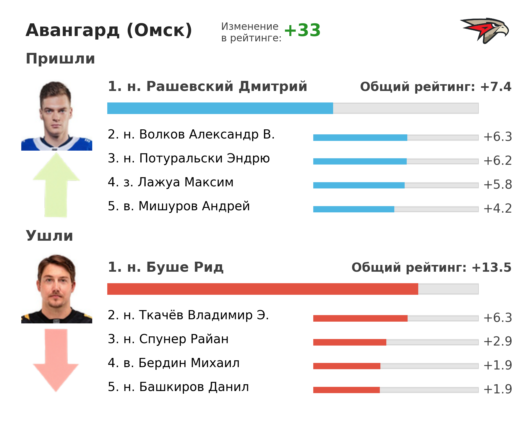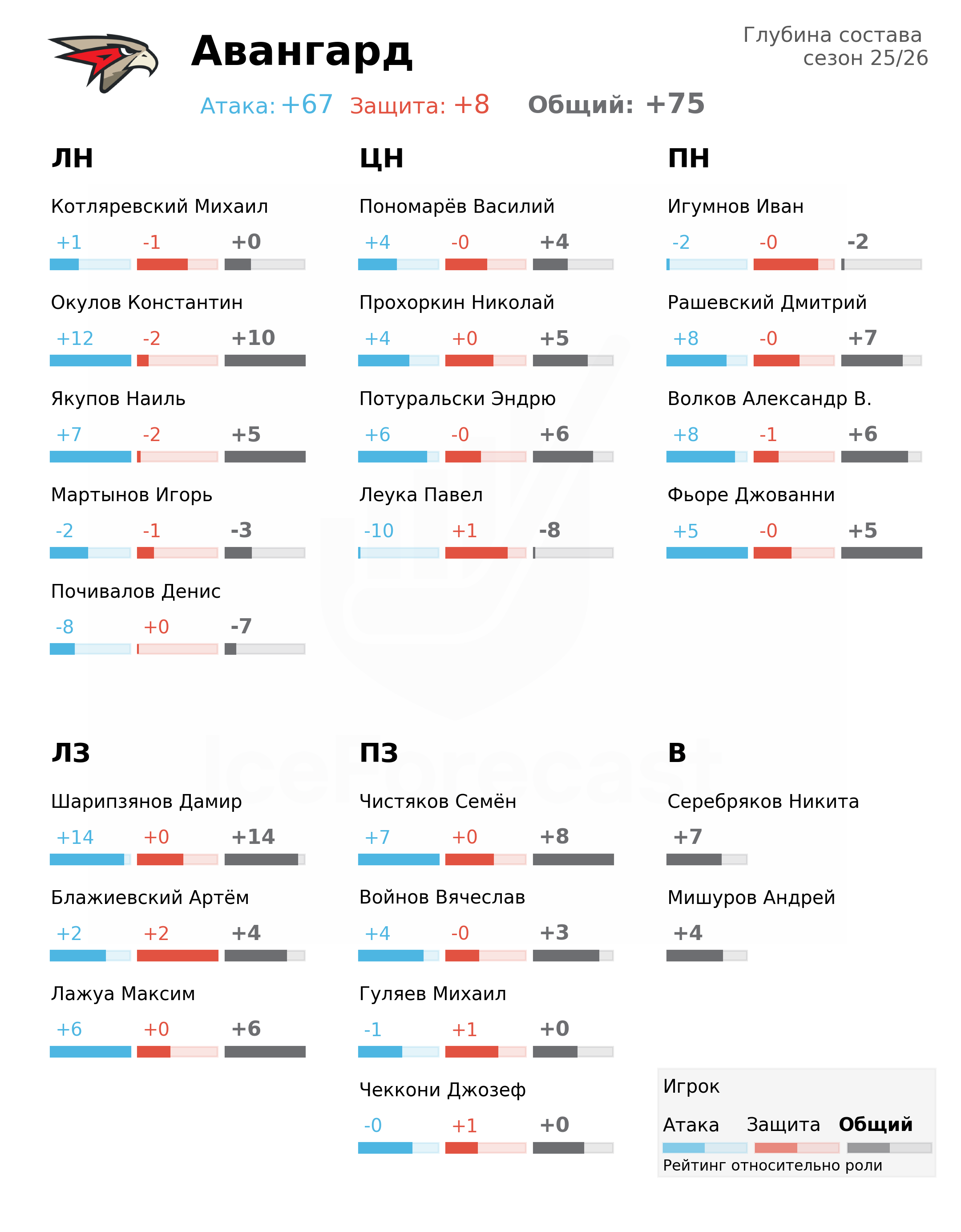 «Авангард» – лучшая команда по общему рейтингу и по атакующим метрикам. Только в глубине нападения омичи немного проигрывают «Автомобилисту» и «Локомотиву». Однако возвращение Майкла Маклауда может вывести омичей в абсолютное лидерство. В обороне команда также не имеет слабых мест: общий рейтинг — лучший в КХЛ, а Дамир Шарипзянов входит в топ-2 защитников лиги.