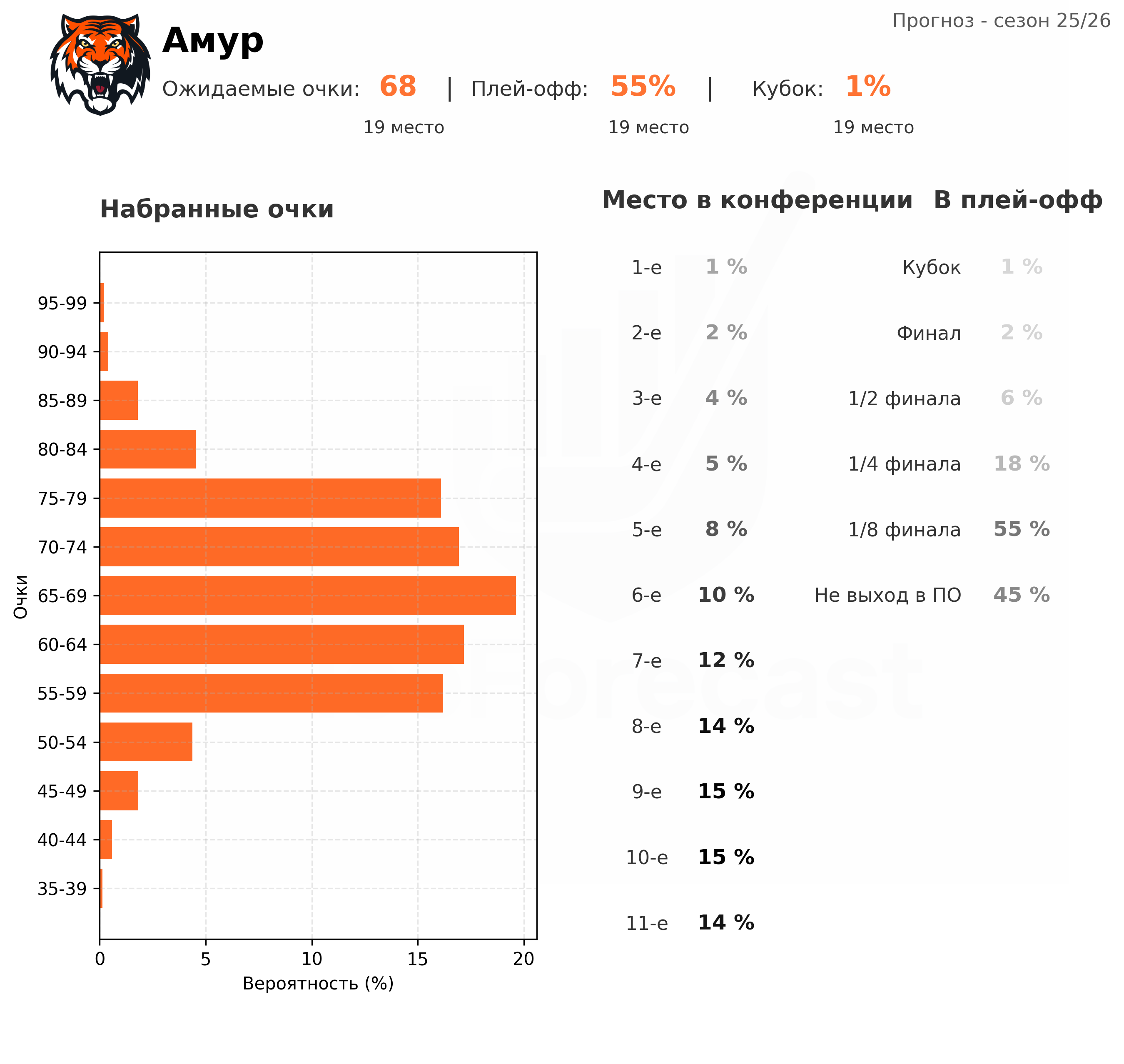 Модель не рассматривает «Амур» фаворитом в борьбе за плей-офф и ожидает команду внизу Восточной конференции. Лучший сценарий — выход в первый раунд с 7–8 места, где шансы пройти дальше выглядят минимальными.
