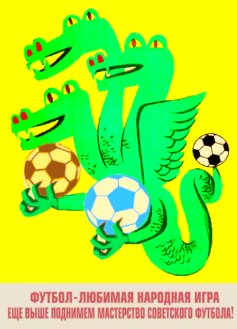 Не стоящие на ногах три вратаря, на фоне мяча, сшитого из зеленого змия и название клуба, вставленное в рамку, подчеркивающую траурность происходящего.