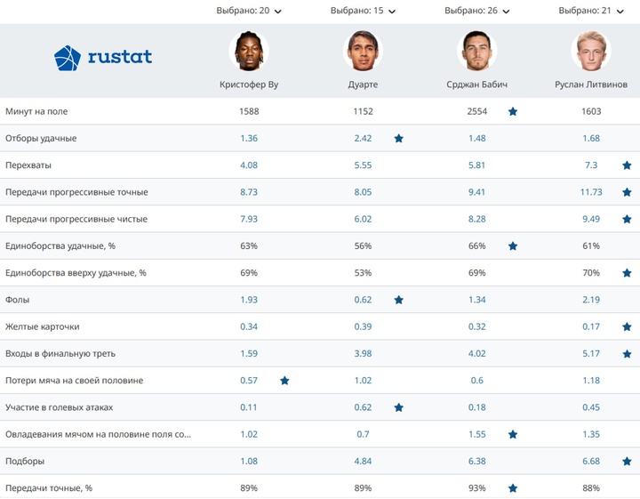 Теперь статистически сравним Кристофера с другими центральными защитниками «Спартака», его будущими конкурентами за место в основе - Бабичем и Литвиновым (добавим в сравнение и уже ушедшего Дуарте), воспользовавшись данными Рустат за прошлый сезон. Так, можно увидеть, что Ву значительно уступает своим партнерам по команде по среднему количеству отборов, перехватов и подборов. Помимо этого новичок гораздо реже участвует в голевых атаках, достаточно редко входит в чужую треть, чаще фолит, но зато меньше теряет мяч и ничуть не хуже Бабича смотрится в единоборствах, в том числе верховых. Тем не менее делать какие-то глобальные выводы по этому сравнению не стоит, поскольку уровень чемпионатов России и Франции существенно различается.