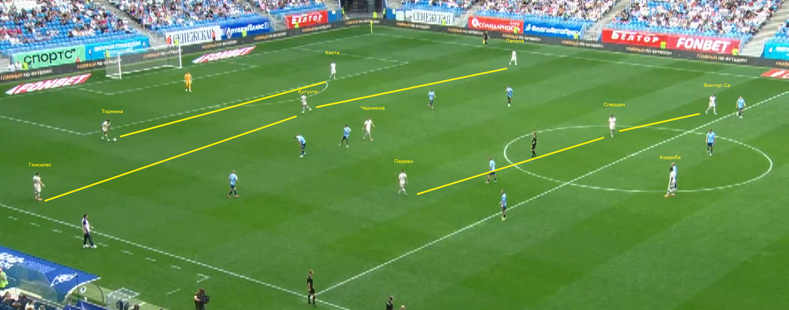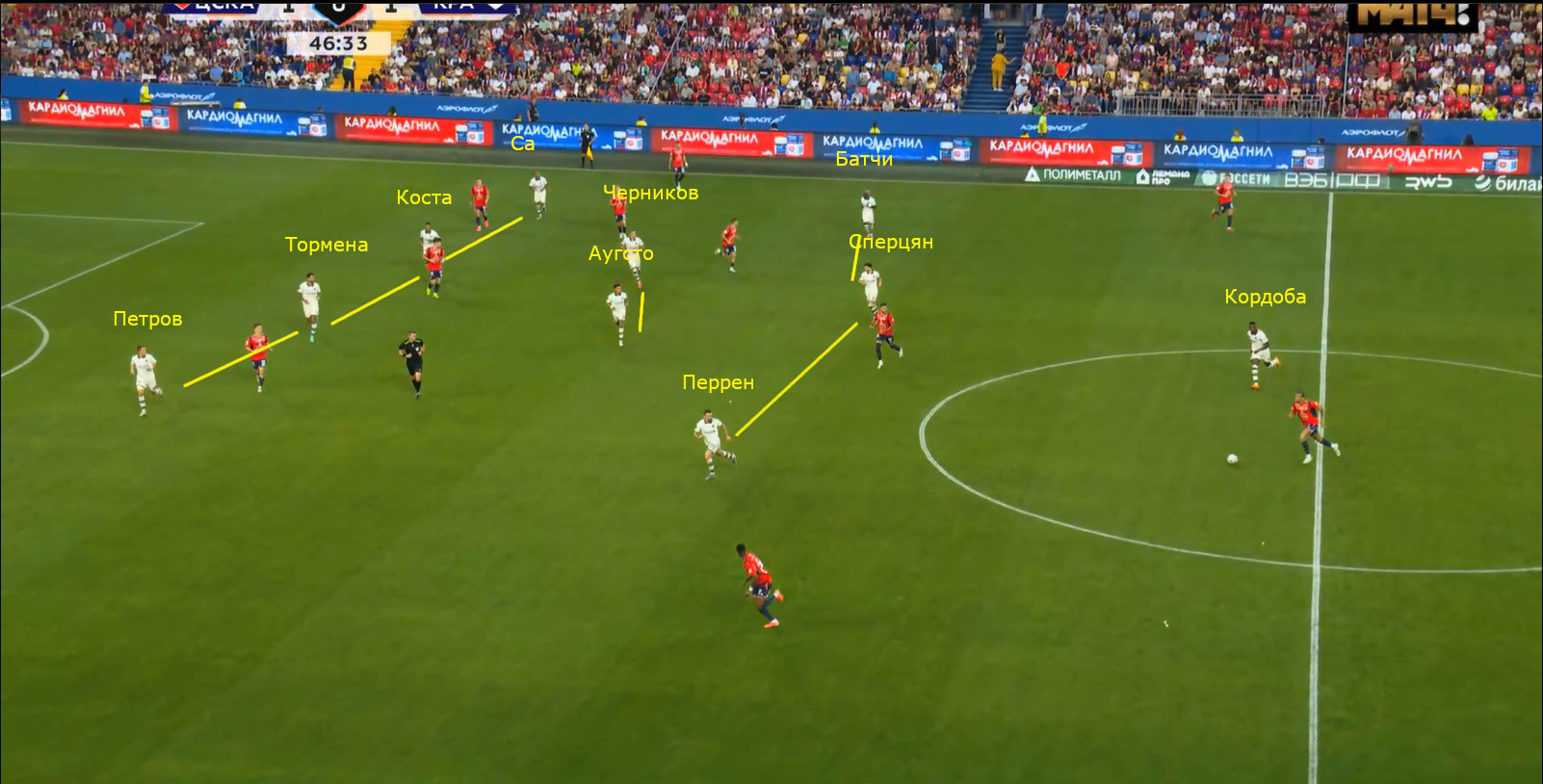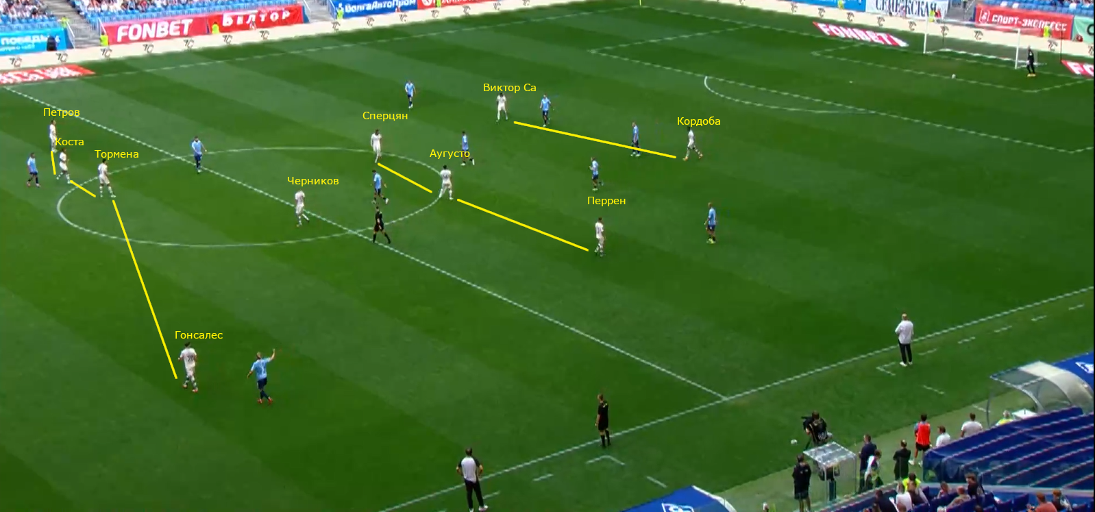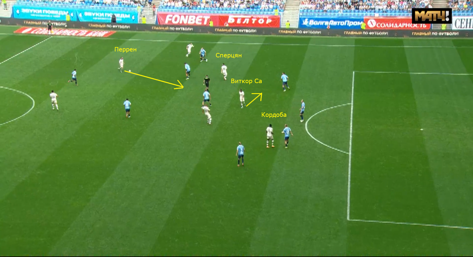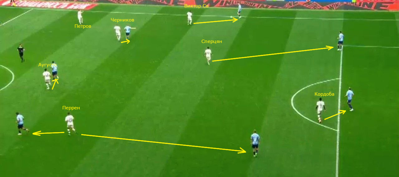 Когда же «Краснодар» прессингует тройку (или пятерку), он также видоизменен. К Кордобе подключается Сперцян, Виктор Са остается на фланге, Перрен контролирует двух оппонентов, Петров подстраховывает Виктора Са, а в остальном сохраняется привязка к персоналиям.