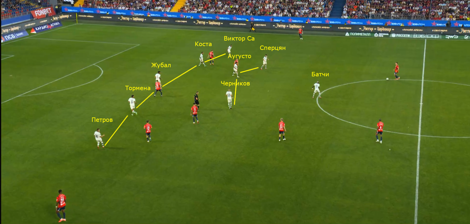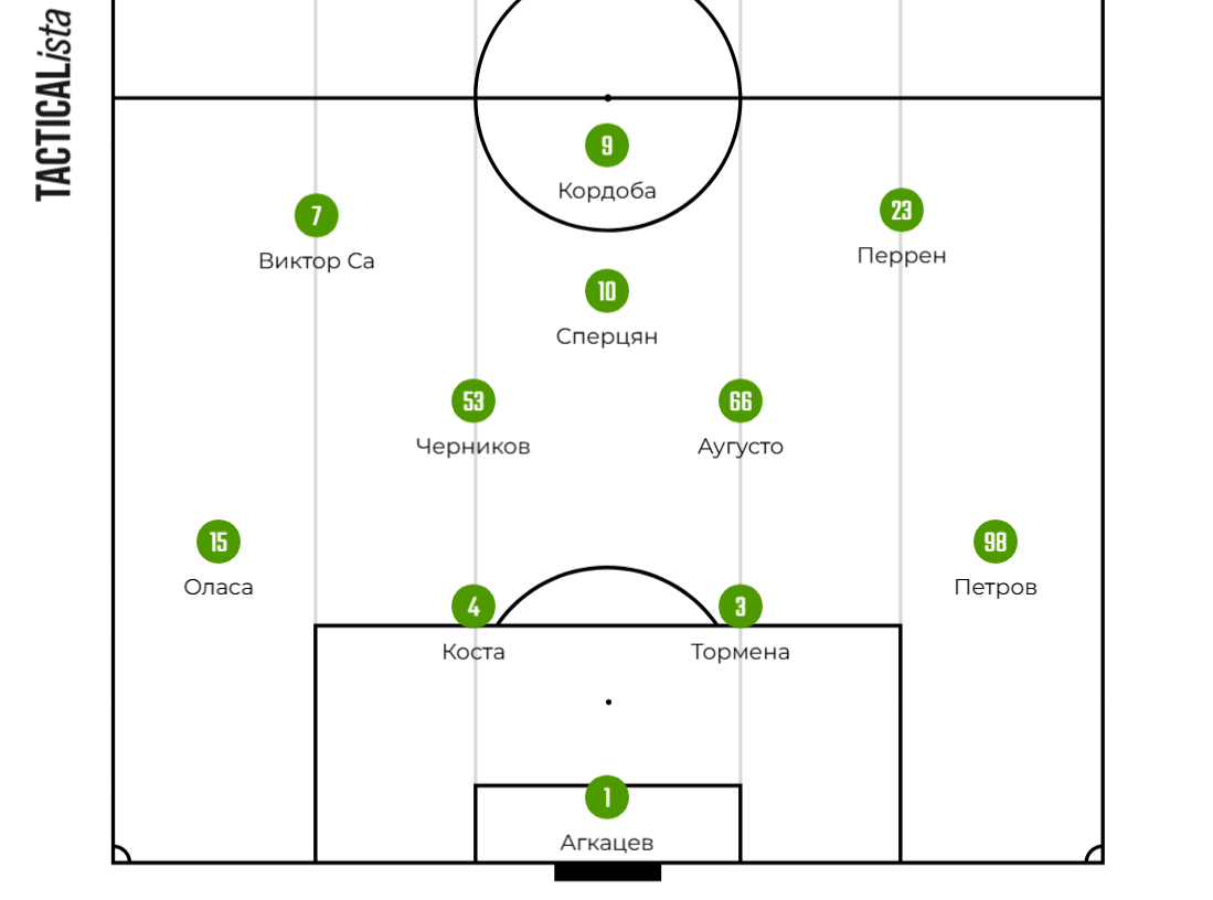 Ну и прежде чем ознакомиться с какими-то тактическими моментами, я предлагаю ознакомиться с оптимальным стартовым составом. Я бы здесь отметил, что Виктор Са и Перрен не просто играют крайних инсайдов, а скорее являются неким дополнением к Сперцяну, и чуть ниже я к этому перейду. И, наверное, у меня остается небольшой вопрос по позиции Петрова в связи с недавней покупкой Пальцева, который рассматривается именно как правый защитник, если судить по заявлению самого игрока.