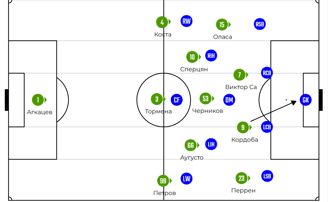 Теперь же приступим к самому разбору и начнем с самого простого элемента в игре «Краснодара» — прессинга. Это единственный элемент, который остался без изменений с прошлого сезона. Да, Мусаев решил поэкспериментировать с прессингом в матче с «Локо», но все же Мурад Олегович решил вернуть все на свои места. Если берем прессинг четверки, то это привязка к персоналиям, но при этом стоит отметить, что Виктор Са поднимается к Кордобе, а Оласа идет на позицию Виктора Са, и такие переходы однозначно облегчают работу Кордобы. Продолжая данную мысль, можно вспомнить слова Мусаева в интервью Cappuccino&Catenaccio о том, что Виктор Са и Оласа предложили такую идею: