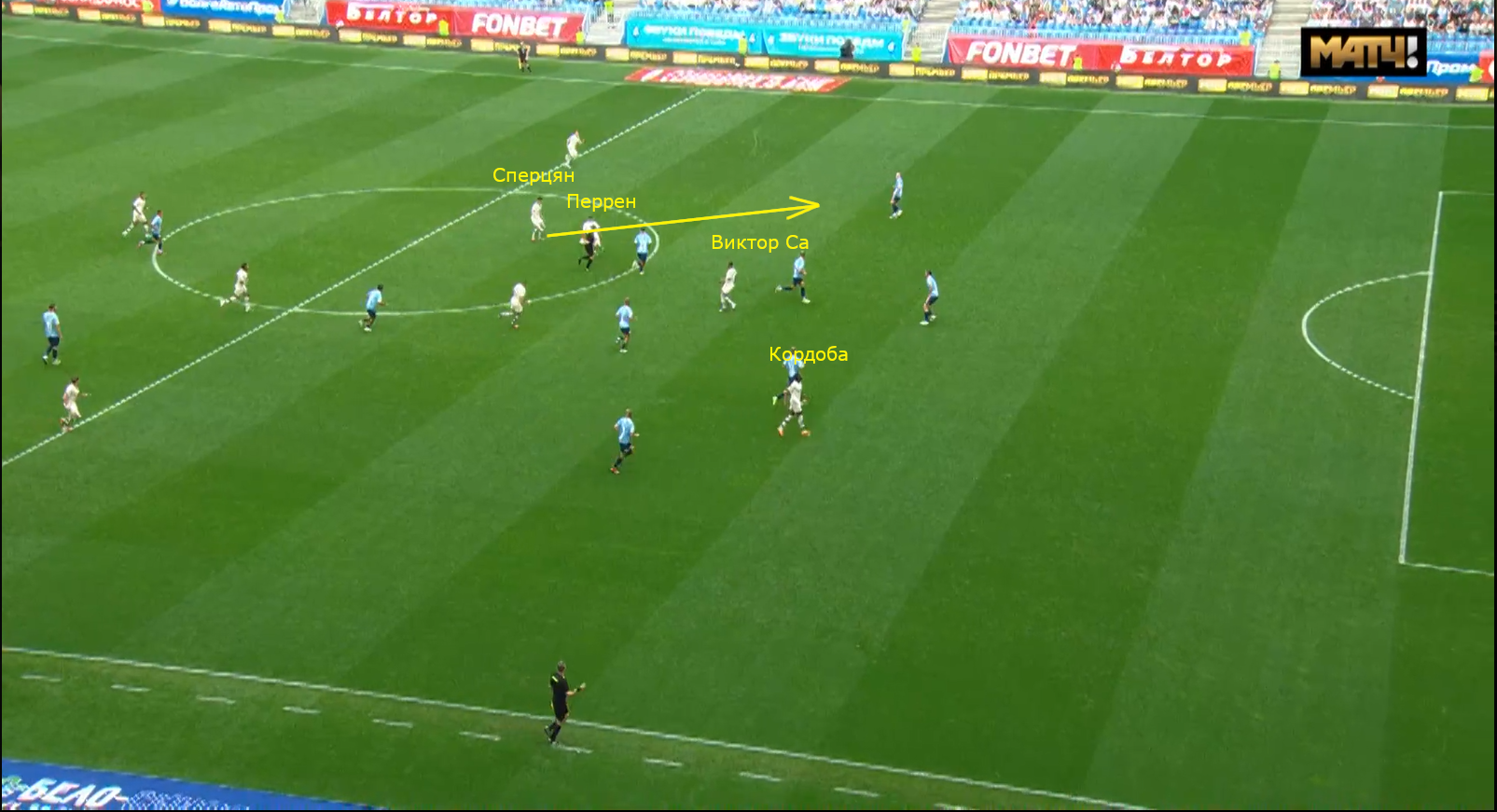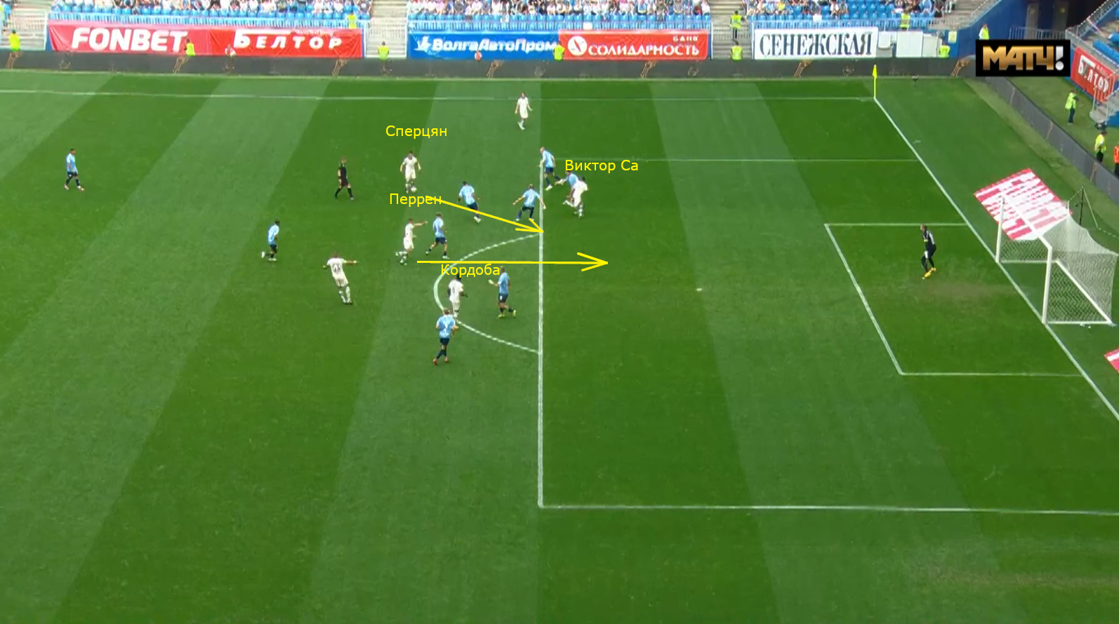 А на пятом скрине видно уже, что Виктор Са получил передаче от Перрена и отдает в касание на Сперцяна, но при этом бразилец отвлекает внимание защитников на себя, что позволяют Перрену ворваться в штрафную площадь соперника.