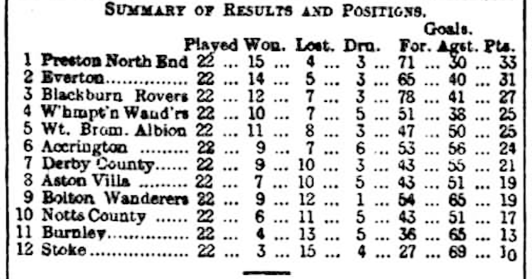 Перед последним туром у «Престона» с «Эвертоном» набралось по 31 очку. По правилам в случае равенства считали разницу голов (делили забитые на пропущенные) – здесь преимущество было у «Норт Энда». Хотя не исключался и «золотой матч». Опять же из-за растянувшегося календаря решающие игры проходили в разные дни. 22 марта «Эвертон» отправился к «Вест Брому», который они две недели назад на Энфилде разобрали со счетом 5:1. Победа, конечно, не гарантировала чемпионства, но мало кто ждал, что «Эвертон» тем дождливым днем на Стоуни Лэйн проиграет 1:4. Через пять дней «Престону» нужно было не пропустить 14 голов в гостях с «Ноттс Каунти», чтобы остаться на первом месте. С этой задачей они справились – 1:0. И взяли второе подряд чемпионство.