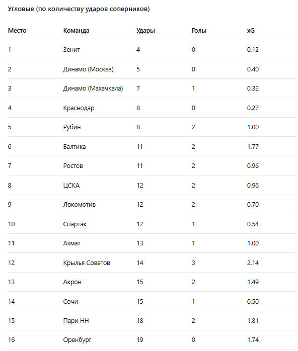«Зенит» и московское «Динамо» меньше всех позволяют соперникам наносить удары после подач с угловых. Махачкалинцы тоже не дают развернуться оппонентам после подач от углового флажка, но всё же уже успели пропустить один гол при xG 0,32.