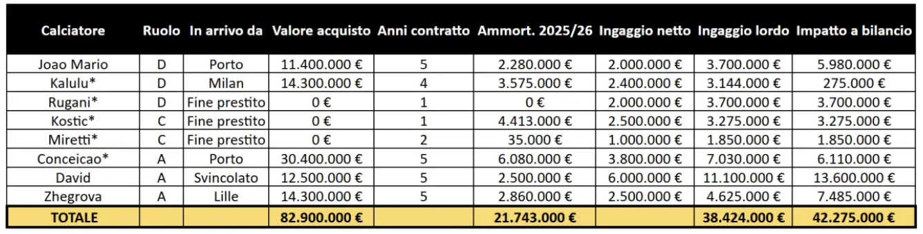 - Impatto su bilancio 25/26 – общий эффект на баланс следующего сезона (сумма плюсов по каждому игроку).
