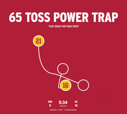 ТЕПЕРЬ, НАКОНЕЦ, МЫ ДОХОДИМ ДО «65 Toss Power Trap». Супербоул IV. Чемпионы НФЛ 1970 года «Миннесота Вайкингс» были фаворитами с преимуществом в 2 тачдауна над чемпионами АФЛ «Канзас-Сити Чифс». «Они говорили нам», — сказал член Зала славы «Чифс» Бобби Белл, — «Что нам даже не стоило приходить на игру».