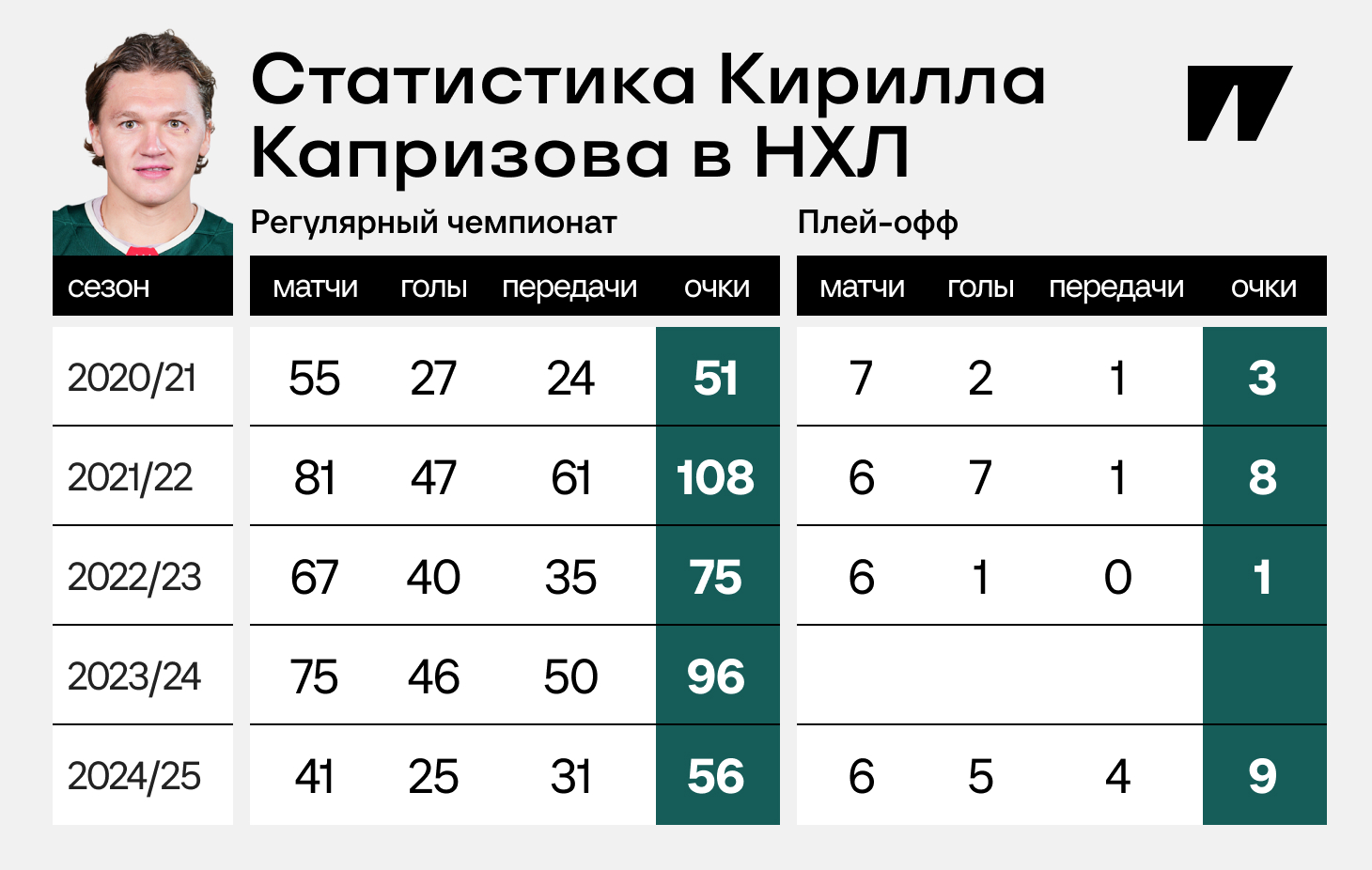 Конечно, «Миннесота» далека от мыслей про чемпионство, она всего трижды в истории проходила первый раунд. Но лидер на то и лидер, чтобы тащить команду всегда – а у Капризова результативные походы в плей-офф чередуются с провальными.