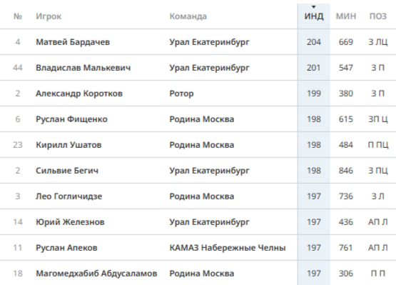 Первые два места за защитниками «Урала» Бардачевым и Малькевичем — 204 и 201 соответственно. Саша третий.
