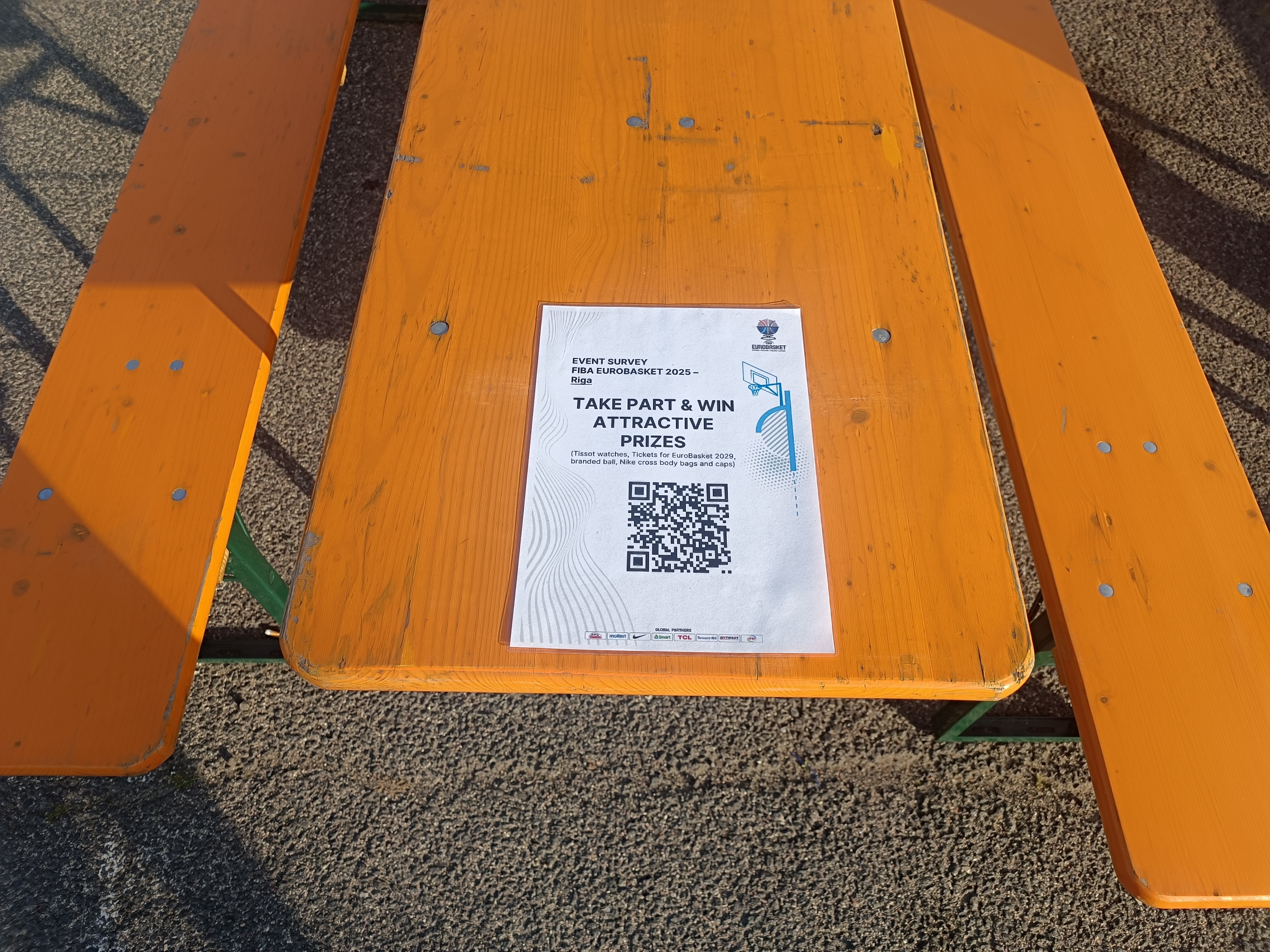 На каждом столе наклеен лист со штрих-кодом, призывающий поучаствовать в конкурсе и выиграть хорошие призы: часы Tissot, кроссовки, сувениры и даже билеты на Евробаскет-2029 (с участием России?).