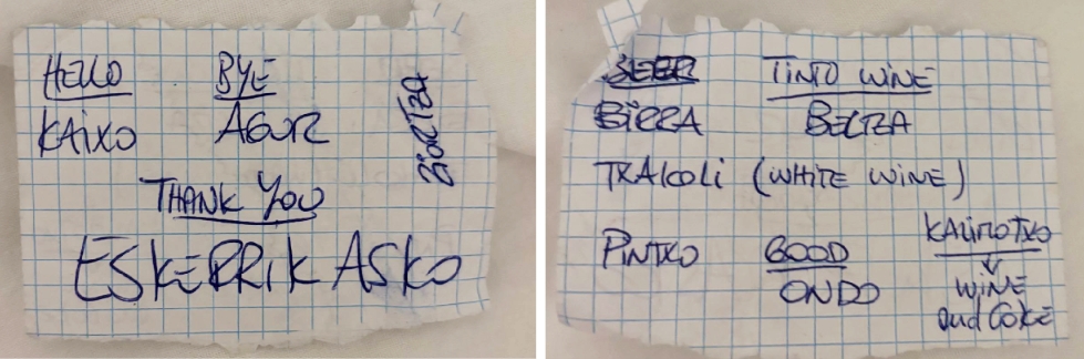 Девушка отрывает кусочек бумаги и пишет основные слова, которые помогут мне во время моего пребывания в стране Басков: kaixo (привет), agur (пока), eskerrik asko (спасибо), birra (пиво), beltza (красное вино), txakoli (белое вино), ondo (хорошо). Меня также знакомят с местным напитком kalimotxo – это смесь красного вина и кока-колы со льдом. Короче, я калимочил в этом кабаке еще пару часов, аж до самого закрытия.