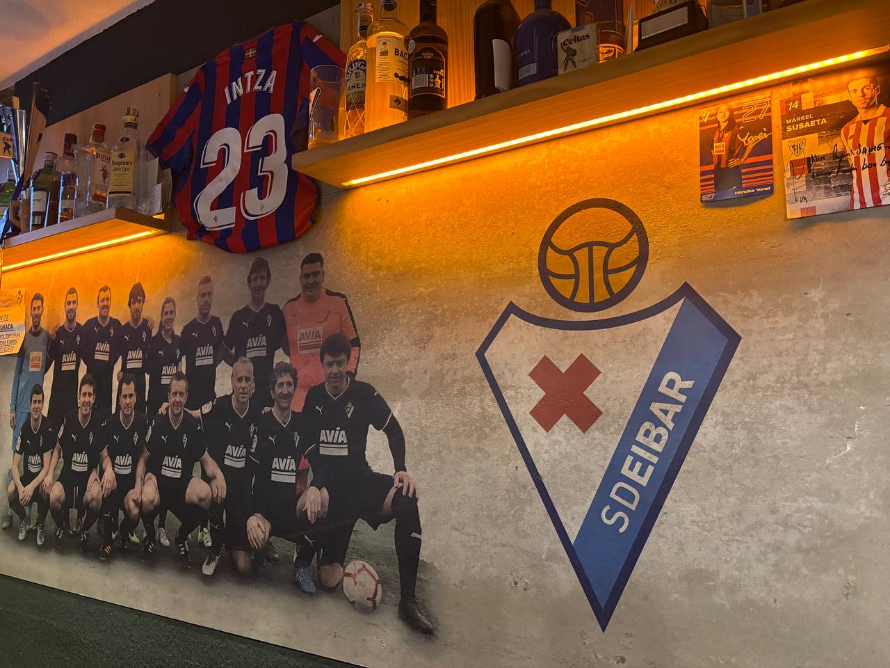Иду в сторону других баров. Смотрю – у одного из них стоит группа людей с напитками, в майках «Эйбара». Явно заскочили после матча! Залетаю в бар, заказываю пивка, осматриваюсь – и понимаю, что весь кабак украшен сувенирами «Эйбара»: кругом майки, вымпелы, фотки, есть даже граффити на стене.