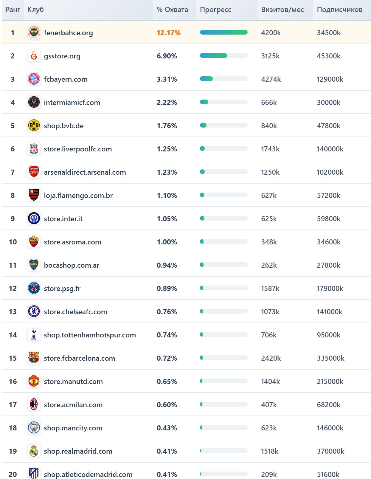 Рейтинги интернет-магазинов футбольных клубов: кто лидирует по трафику, качеству и охватам? Что с ценами?