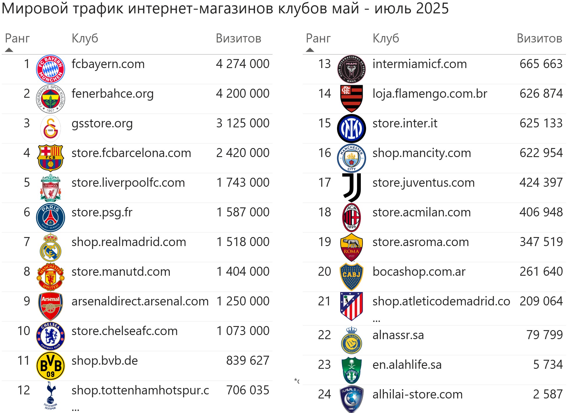 Данные собраны за май-июль 2025 года в сервисе SimilarWeb – самый популярный инструмент анализа веб-трафика для конкурентной разведки (предоставляет данные с лагом в 1.5-2 месяца). Сайты отобраны согласно исследованию Sports.ru – 100 самых популярных клубов мира (по количеству подписчиков в социальных сетях).