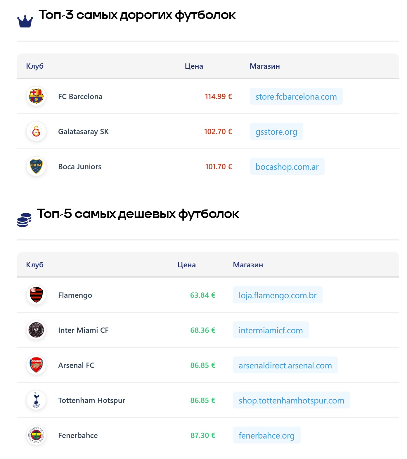 Единственный клуб, который сильно выделяется с относительно высокой стоимостью базовой футболки – «Барселона». «Галатасарай» сильно контрастирует на фоне «Фенербахче», а стоимость футболки «Бока Хуниорс» может быть сильно подвержена изменениям в курсах валют. В Бразилии другой порядок цен и возможно за 100€ в местной валюте футболка бы не продавалась, а вот для Майами 80$ кажется дешево, но там наверняка основной спрос на значительно более дорогую футболку — Месси продается за 150$ (мог бы занять 4 место в рейтинге стоимости футболок фаворитов на ЗМ-2025). «Арсенал» и «Тоттенхэм» и здесь идут рука об руку — по 86.85€, тогда как у всех остальных английских топов цена совсем немного ниже 100€.