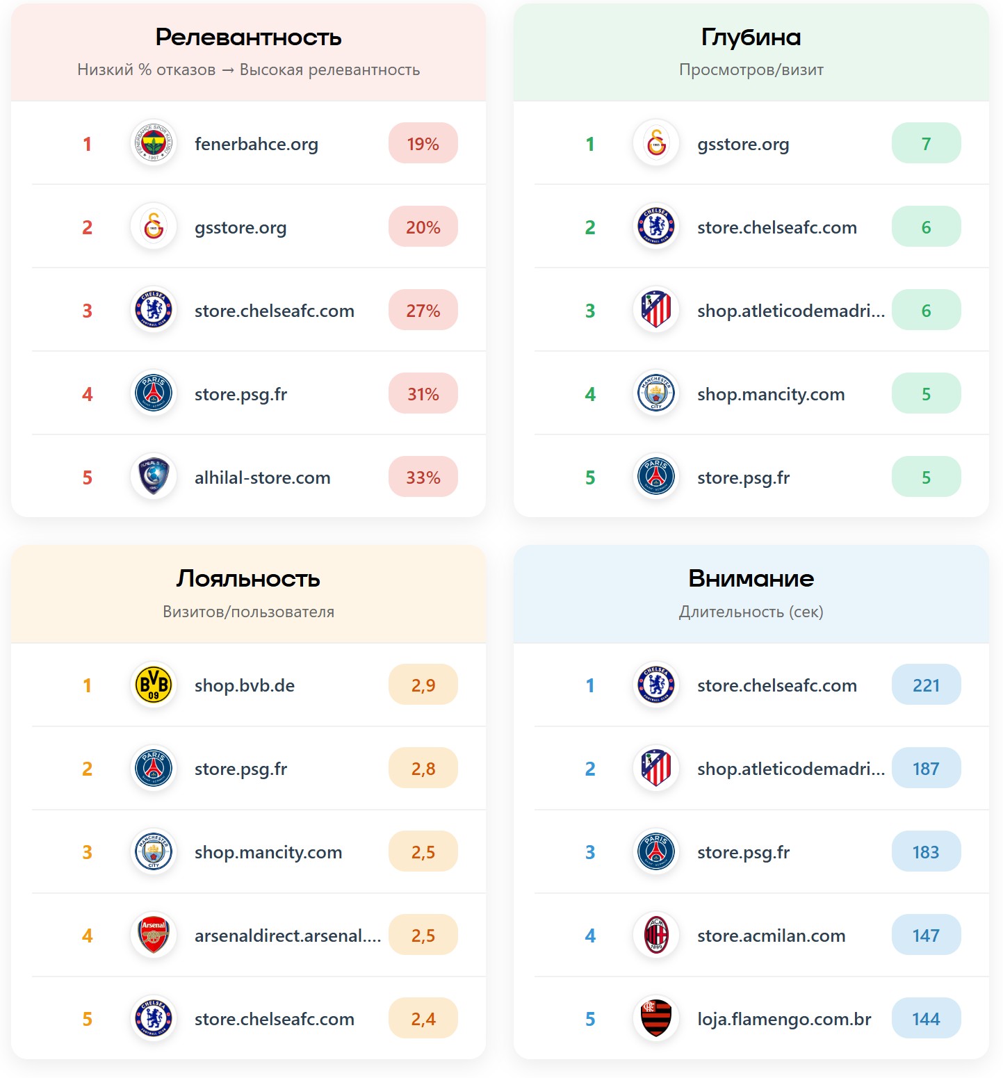 Высокие показатели просмотров страниц и длительности визита теоретически могут быть следствием сложной навигации на сайте, когда пользователи вынуждены долго искать нужный товар. Однако учитывая, что все анализируемые сайты принадлежат крупным футбольным клубам и многие имеют схожий уровень юзабилити и навигационной структуры, мы можем предположить, что пользовательский опыт примерно одинаков. Поэтому представленный ниже рейтинг можно в равной степени считать показателем как качества самого сайта, так и качества трафика (лояльности и вовлеченности аудитории).