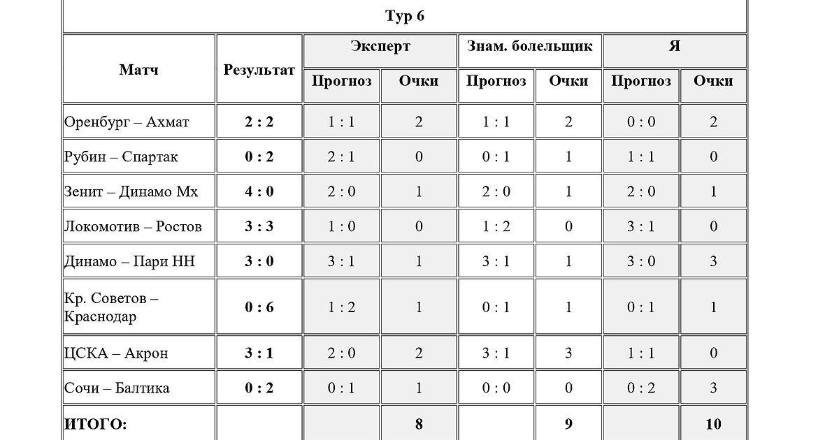 И вот пару туров назад, я решил проверить себя. Как мои прогнозы будут выглядеть на их фоне? Неужели я уступаю Экспертам, или не дай бог каким-то там звёздам, ведь я разбираюсь в предмете.