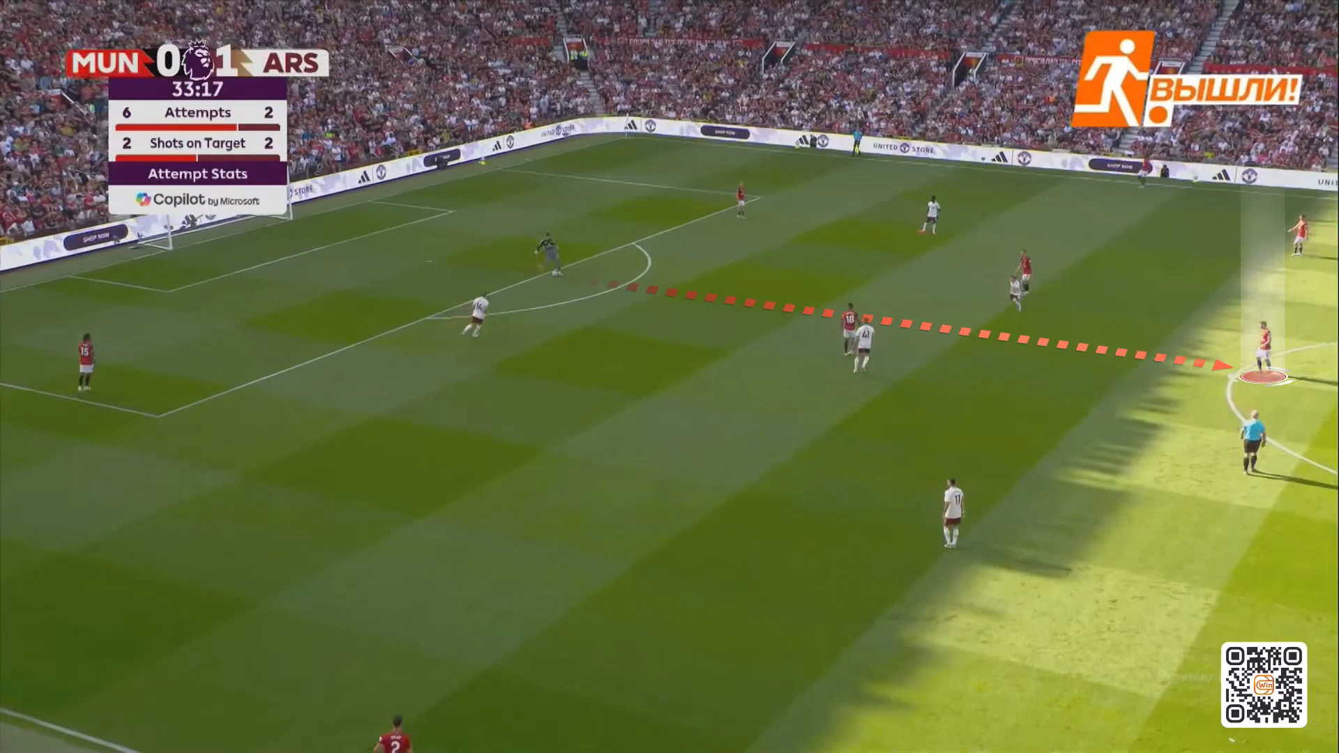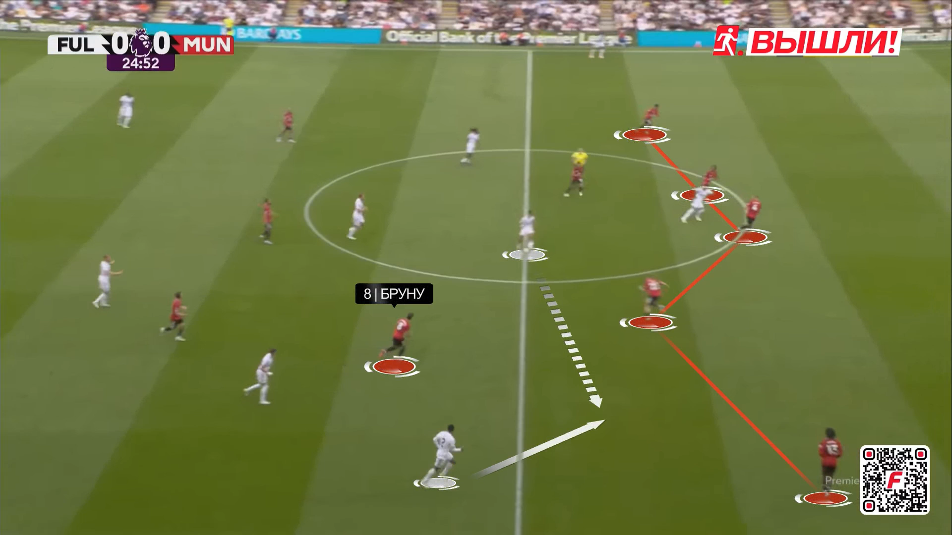 В построениии атаки у «МЮ» работают те же принципы, которые просматривались на предсезонке: внешние центральные защитники расходятся по флангам, центральный поднимается в опорную к Каземиро/Угарте и команда пытается реализовать задачу по доставке мяча за спину этой четверке (и опекающим их соперникам) в полуфланговые каналы инсайдам.