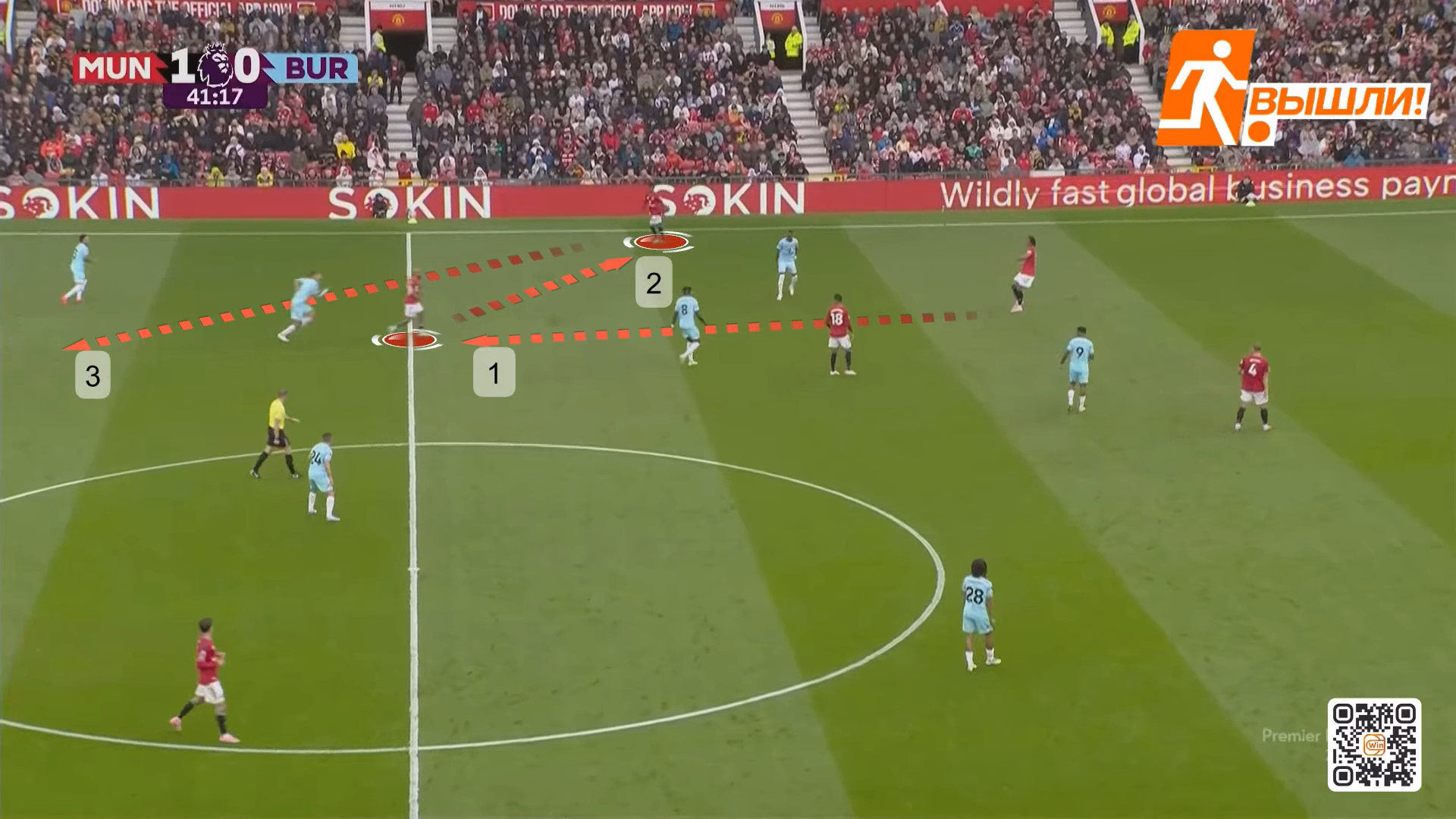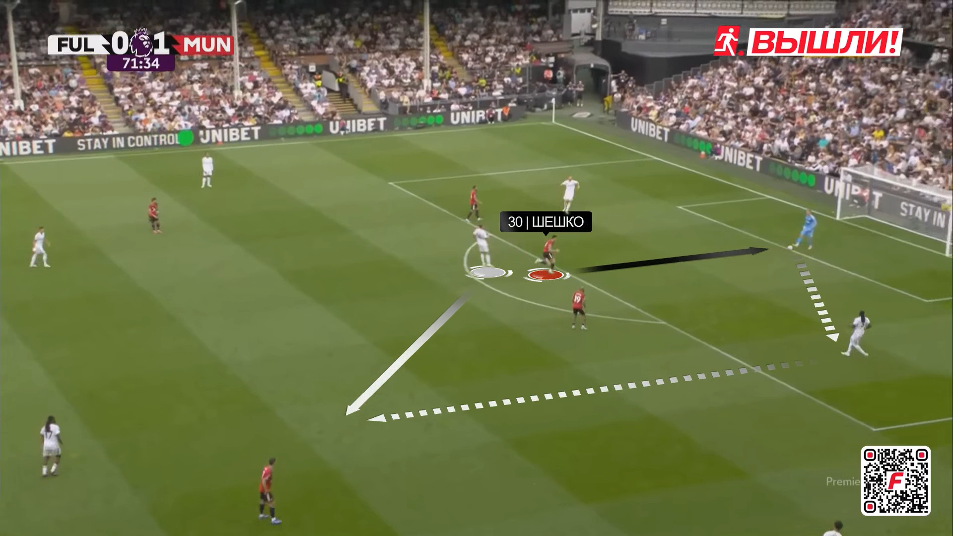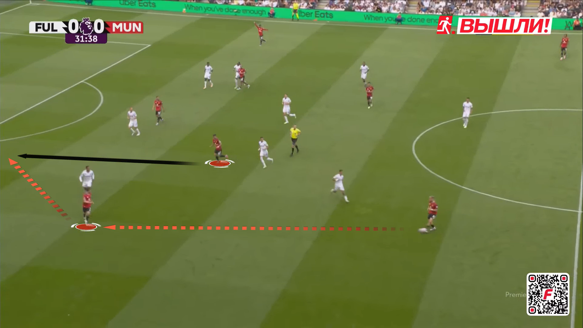 С первым компонентом ситуация относительно сложная – Каземиро не в состоянии поддерживать должный объем оборонительных действий все 90 минут, а Угарте часто совершает позиционные ошибки. Поэтому чаще всего соперники выманивают опорных «Юнайтед» по одному из своих позиций, а затем доводят мяч до своего дальнего ЦП/инсайда.