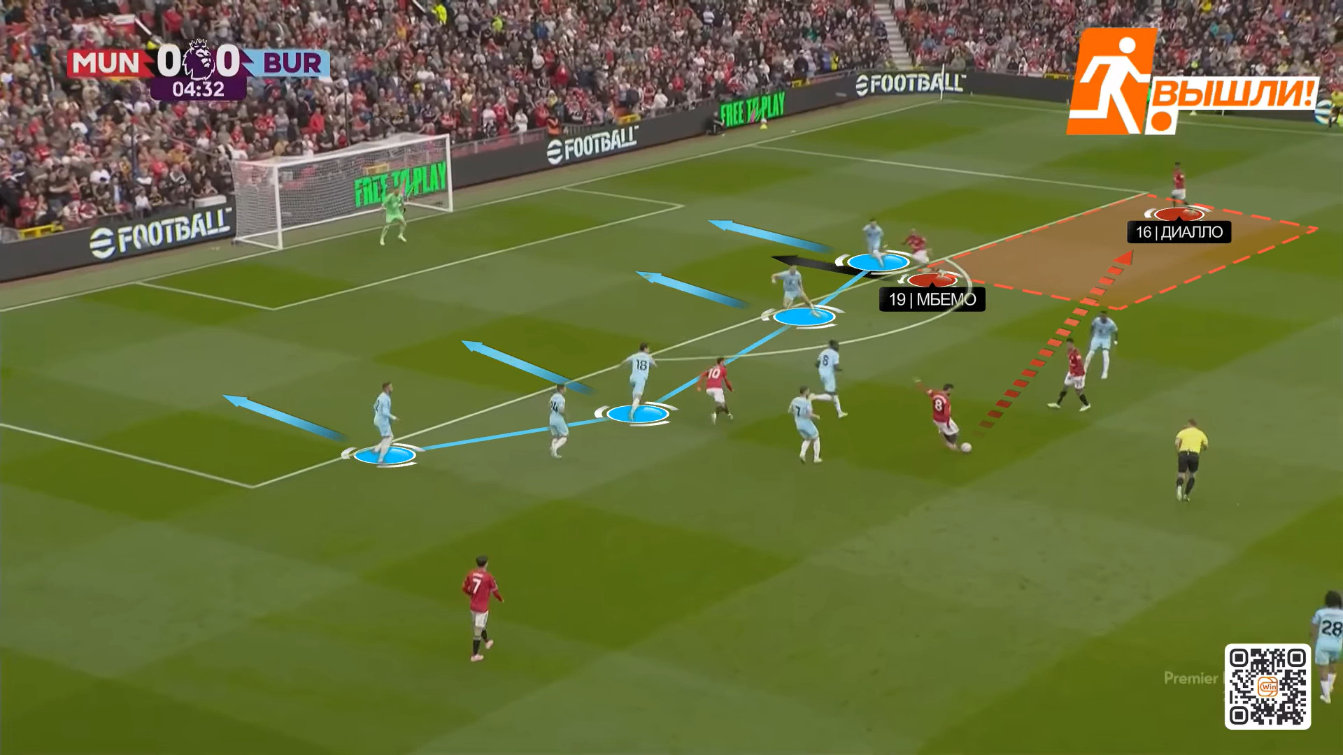 Со вторым компонентом ситуация складывается по принципу карточного домика и провоцирует сбои в линии обороны – выдергивания игроков из линии, несогласованность в перестроениях и, как результат, пропущенные мячи. Системность данных сбоев отлично иллюстрируют голы, пропущенные командой Аморима от «Фулхэма» и «Бернли» (второй мяч).