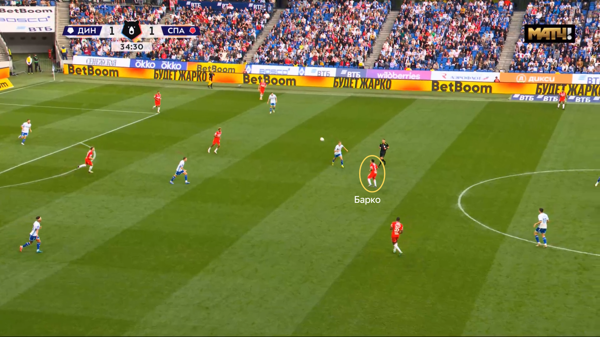 Здесь было два сценария. Либо аргентинец получал мяч в свободной зоне и развивал атаку. Либо его успевал накрыть поднимающийся из линии обороны Осипенко. Но защитник «Динамо» не всегда успевал за своим оппонентом. Поэтому зачастую «Спартак» пытался развивать свои атаки именно через Барко.