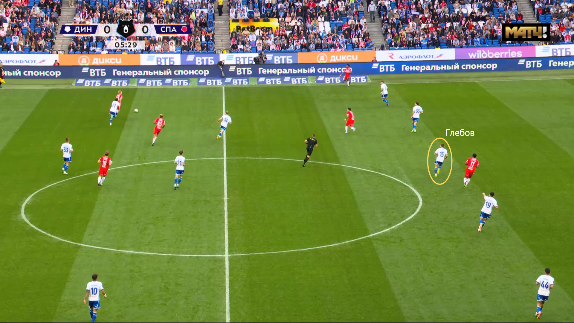 В прессинге атакующая тройка ориентировалась на трех центральных защитников «Спартака». При этом в центре поля Глебов поднимался выше других полузащитников «Динамо» и следовал за Умяровым. В такой ситуации схему можно зафиксировать как 4-2-1-3.