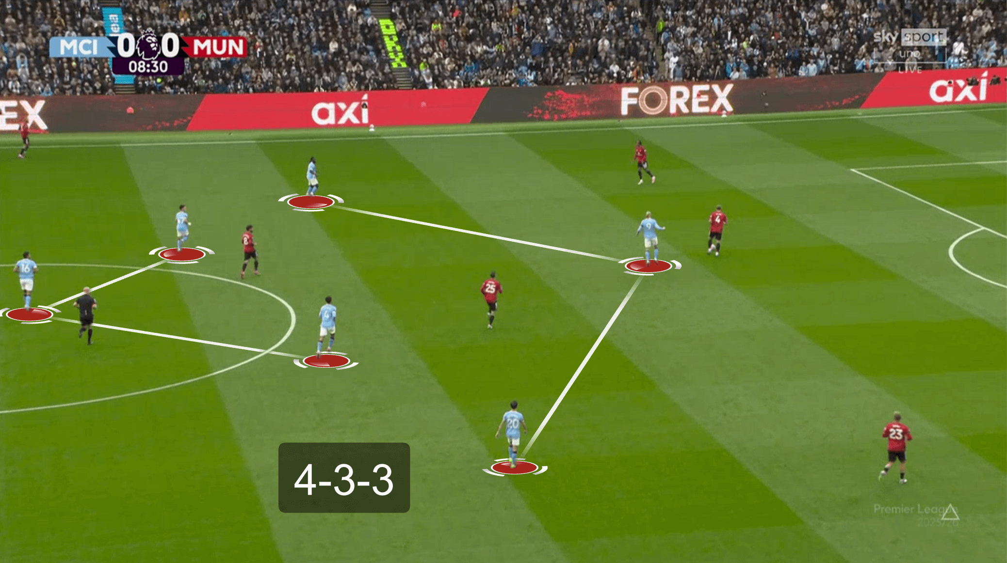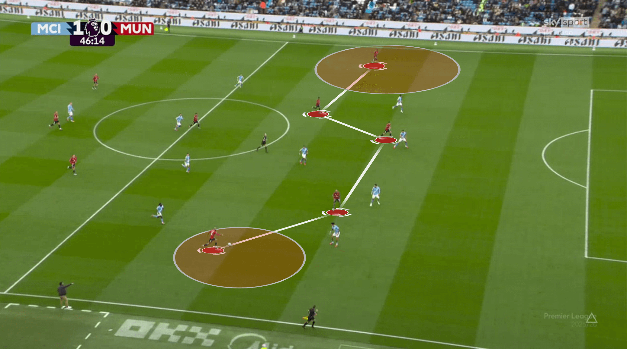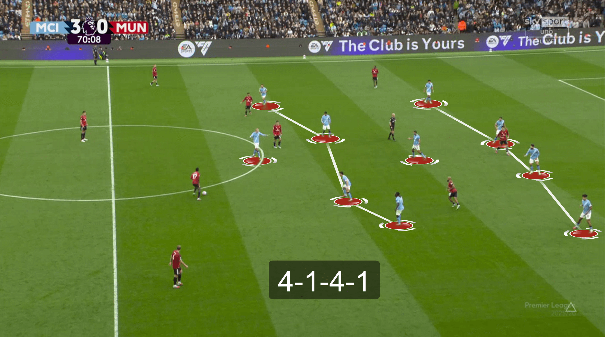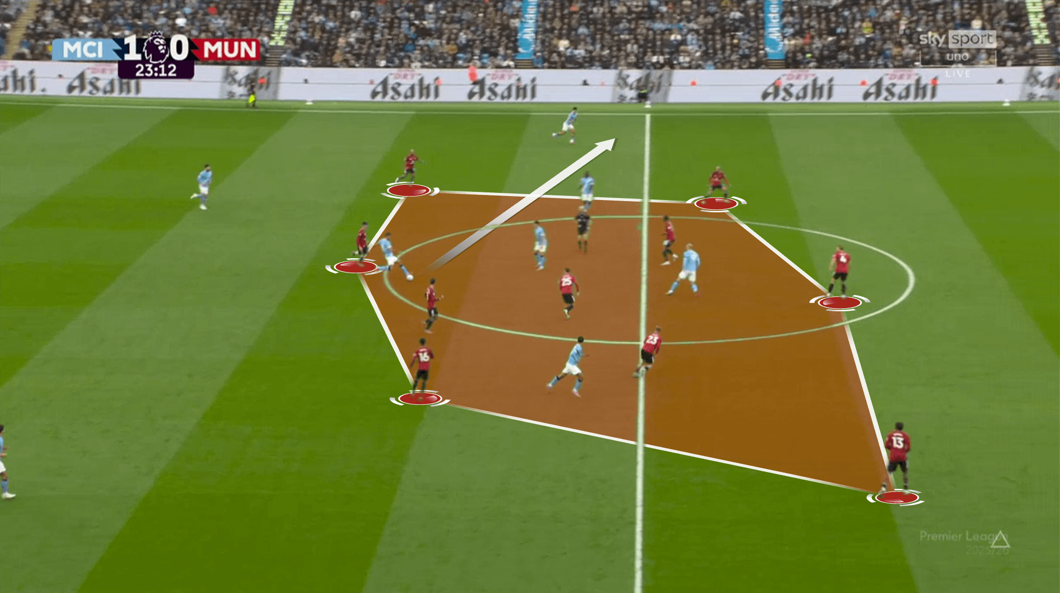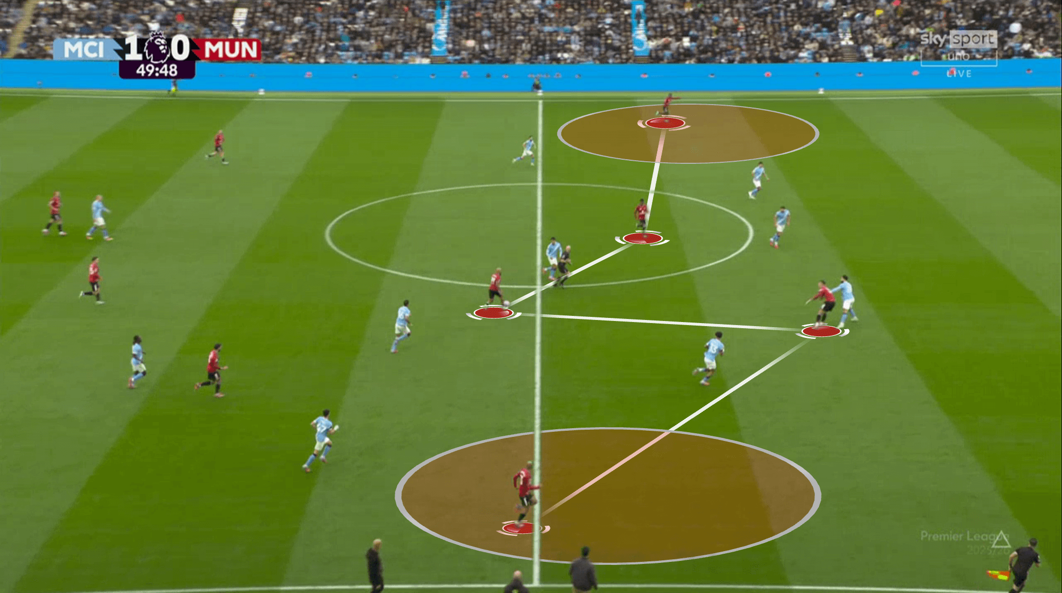 У «Юнайтед» не получалось накрыть всех сразу. В эпизоде с первым голом хозяев было сразу две неудачные попытки – сначала на чужой половине, потом на своей. Передача соперников друг другу тоже страдала. Химии особенно недоставало опорникам и тройке ЦЗ. Вот показательный эпизод – команда сбивается в кучу, но это никак не помогает затруднить Родри продвижение мяча:
