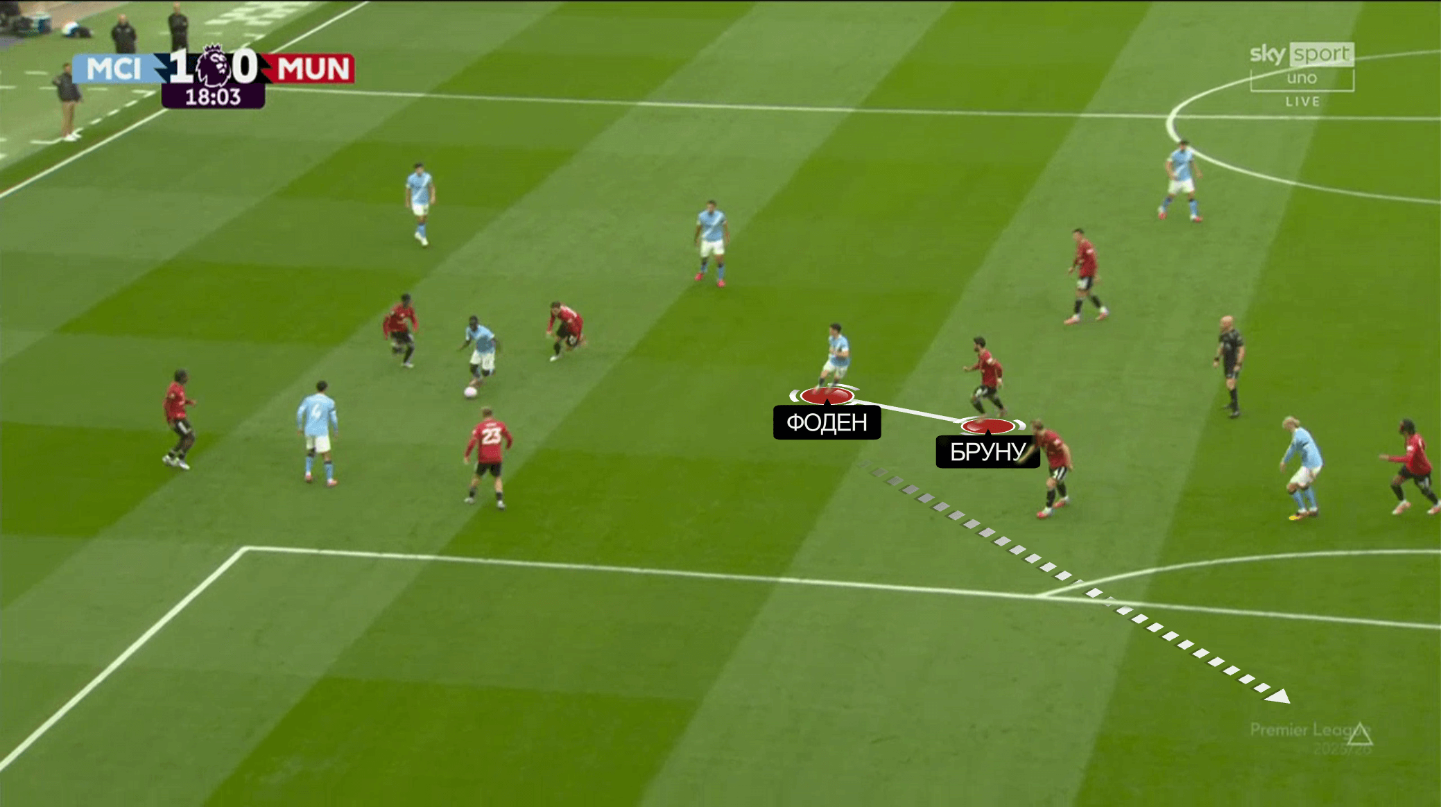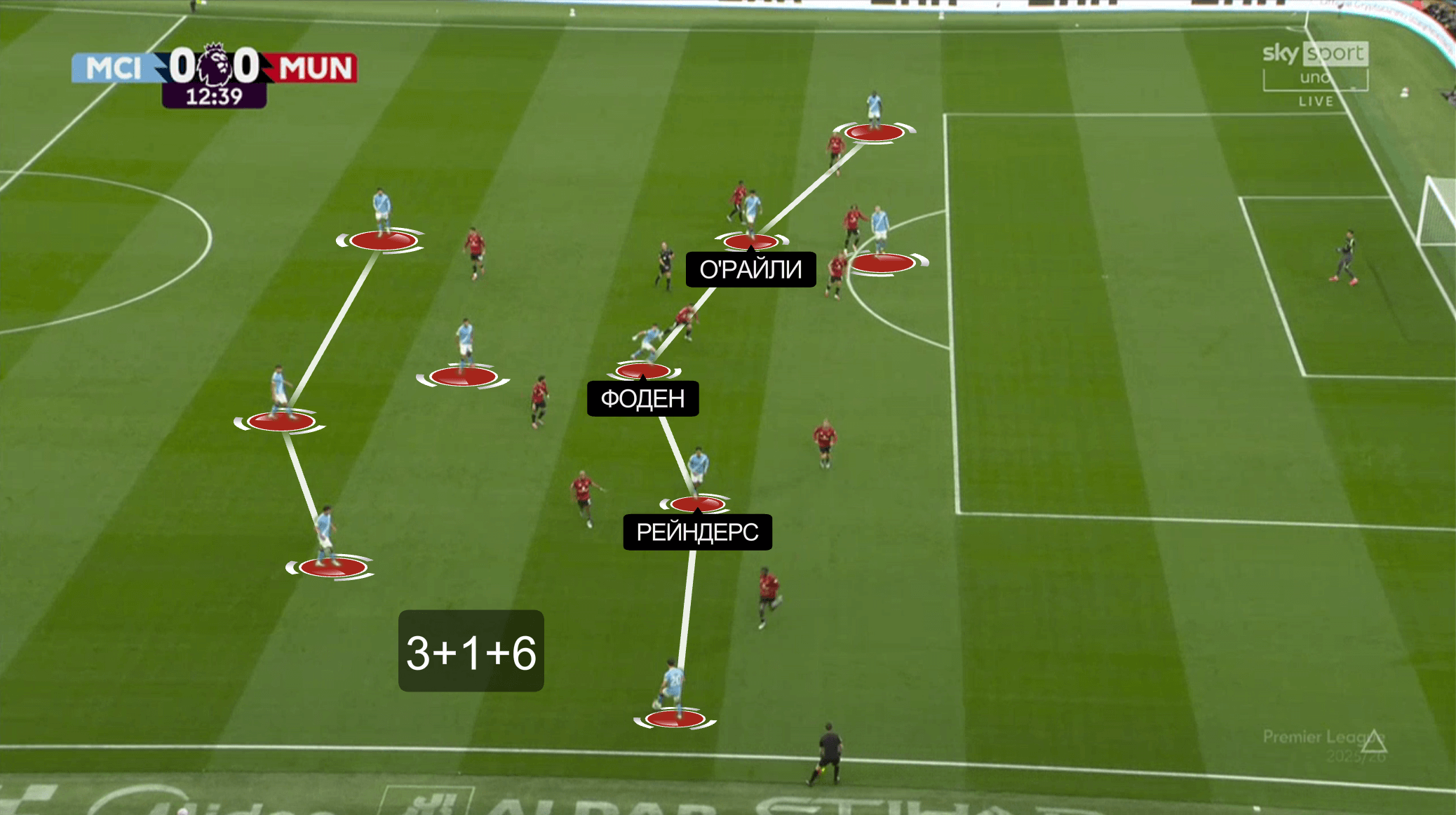Классический эпизод из дерби – схема Аморима создает «Юнайтед» выгодные соотношения в последней линии. Очень много свободы у латералей Мазрауи и Доргу. Чтобы довести до ума, нужно лишь доставить мяч вперед, а атакующим игрокам разобраться.
