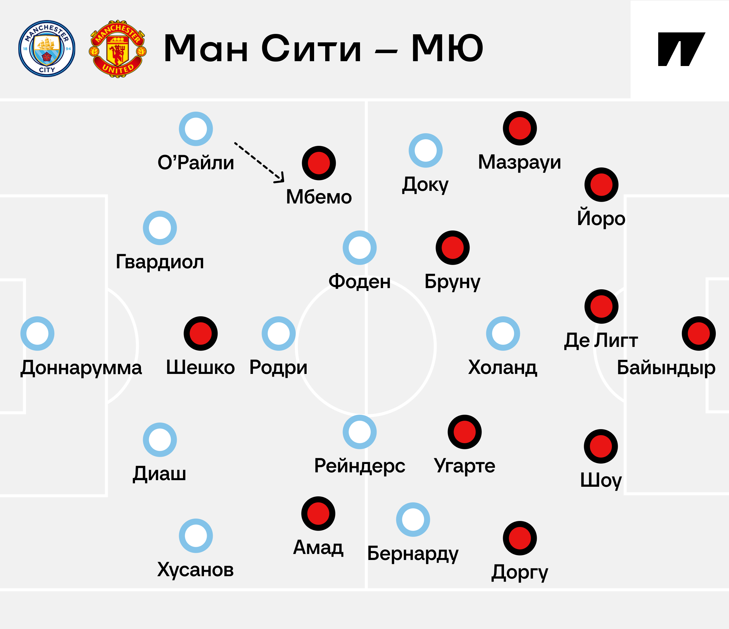Аморим не стал менять вратаря, хотя «МЮ» тоже подписал новичка – Сенне Ламменса – перед закрытием окна. Алтай Байындыр вновь получил шанс в основе. Головоломкой стали травмы Мэйсона Маунта и Матеуса Куньи – ключевых исполнителей в атакующей тройке «МЮ». Их пришлось менять на Амада Диалло (вышел на непривычной позиции слева) и Бенжамена Шешко (впервые вышел в АПЛ как основной).