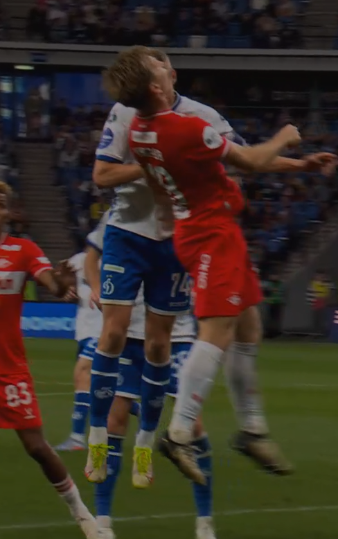 Концовка матча. Динамо верхом забрасывает матч в штрафную Спартака. В первом эпизоде Егоров ,смотря в упор из хорошей позиции, не видит, что Марричаль руками опирается на Денисова. Во втором эпизоде ,спустя секунды, внезапно замечает какое то нарушение со стороны Фомина на Умярове и игнорируя тот факт, что Умяров борьбу выиграл, а мяч остался у Спартака,