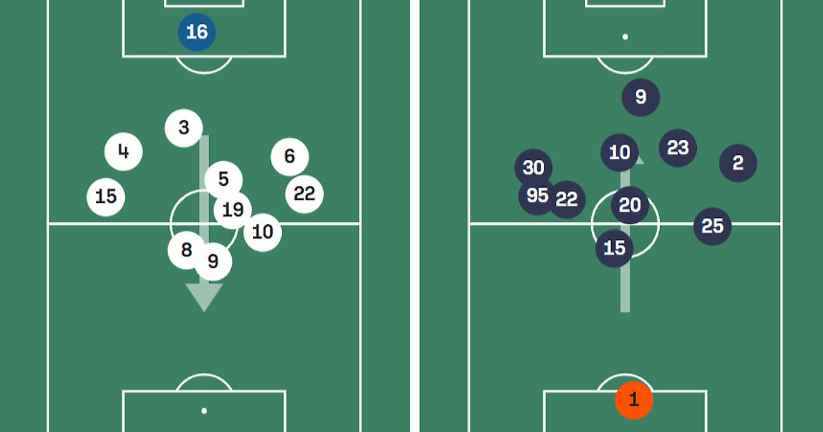 В свою очередь, перед Игорем Тудором возникла задача в виде отсутствия двух важных игроков – Камбьяссо и Консейсау. Решил он ее своеобразно: на позицию Консейсау вышел Копмейнерс, который по функциональности абсолютно другой игрок, но это сыграло даже в плюс команде – в полузащите команда действовала очень гибко, постоянно меняясь позициями. Из неких констант выступала только позиция и функции Локателли, а К. Тюрам, Тен и Кенан постоянно пытались запутать своих опекунов своими перемещениями, так голландец в одном эпизоде мог оказаться при розыгрыше справа, а при следующей позиционной атаке уже помогать Маккенни слева. В свою очередь, Маккенни пытался играть классического бровочника. Данные изменения выглядели достаточно интересно, но сценарий матча ограничил возможность более тщательно изучить такую задумку («Ювентус» дважды по ходу первого тайма выходил вперед и после второго забитого мяча переключился в режим «играть по счету в низком блоке»).