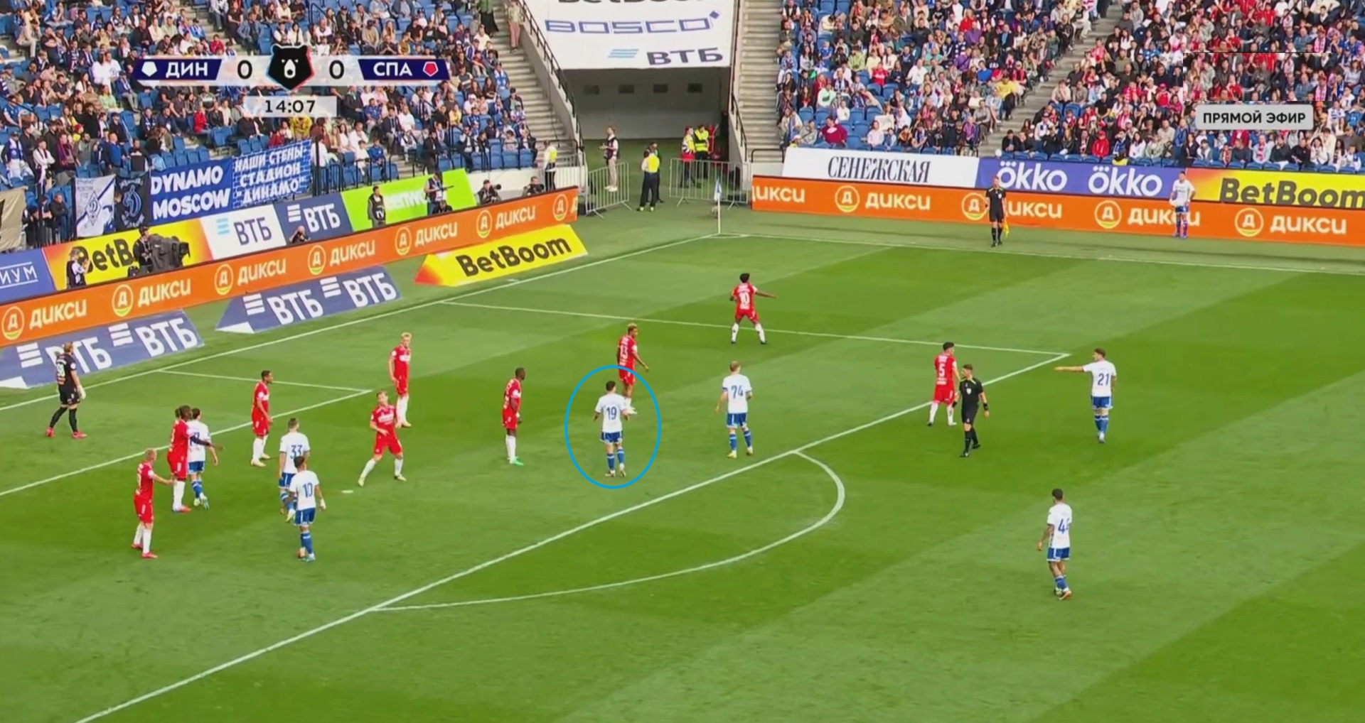 Отыгралось Динамо также легко, как и пропустило — обычный навес с очередного штрафного, никто не трогает мяч, а дезориентированный Максименко остался стоять на ленточке ворот. В этом моменте свою положительную роль сыграл Зайнутдинов, но не от желания реабилитироваться за свою ошибку, а просто у него была установка — искать мяч в штрафной соперника. Вот, например, на 15-й минуте, ещё при 0:0, он тоже оказался близко к центру нападения.